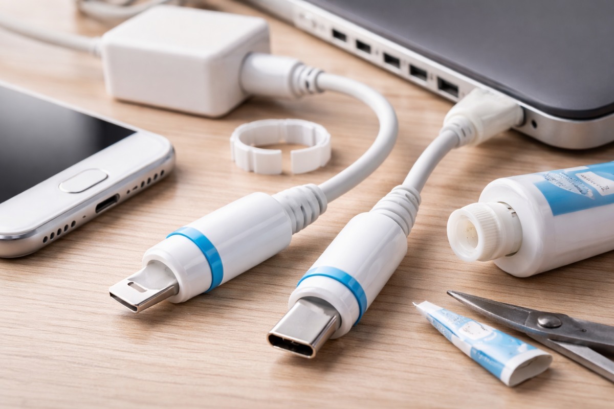 깨끗하게 세척한 치약 튜브를 이제 일상에 활용해 보자. 스마트폰 충전기나 노트북 어댑터 케이블의 연결 부위가 꺾여 피복이 벗겨지는 '단선 사고'는 누구나 한 번쯤 겪는 고충이다. 이때 치약 튜브의 주둥이 부분, 즉 뚜껑이 결합하는 단단한 플라스틱 파츠가 해결사가 된다.