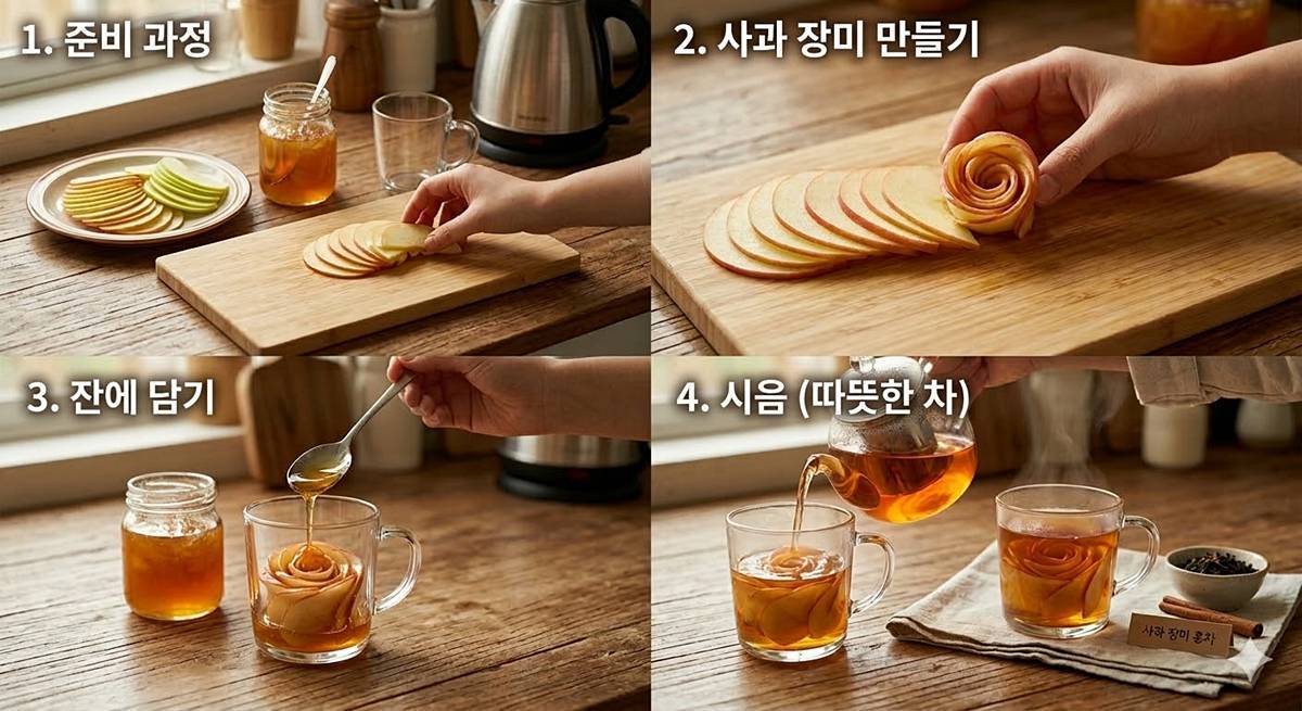 활용법도 꽤 근사하다. 얇게 자른 사과를 가로로 여러 장 겹쳐 놓고 끝에서부터 돌돌 말면 장미꽃 모양이 된다. 이를 잔에 넣고 사과청에서 나온 시럽을 함께 담은 뒤 따뜻한 물이나 홍차, 또는 탄산수를 부으면 보기에도 예쁜 음료가 완성된다. 잔 안에서 사과꽃이 피어나는 듯한 모양이 만들어지고, 달콤하면서도 상큼한 향이 퍼져 기분까지 산뜻해진다. 따뜻하게 마시면 포근한 과일차 느낌이 살고, 탄산수를 더하면 시원한 에이드처럼 즐길 수 있어 활용 폭도 넓다.