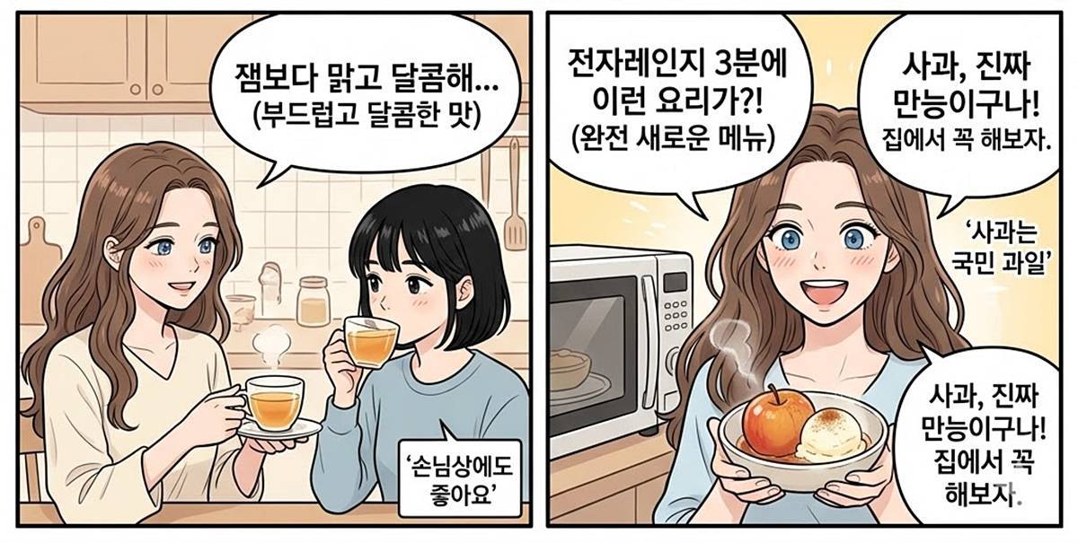 사과가 여전히 ‘국민과일’로 불리는 이유도 이런 친숙함과 활용도에 있다. 쉽게 구할 수 있고, 남녀노소 거부감 없이 먹기 좋으며, 생으로 먹어도 되고 차나 디저트로 바꿔도 잘 어울린다. 늘 먹던 사과 한 개를 전자레인지에 3분 돌렸을 뿐인데 전혀 다른 메뉴가 완성된다는 점은, 평범한 재료의 숨은 매력을 다시 보게 만든다. 사과가 집에 있다면, 이건 한 번쯤 꼭 따라 해볼 만하다.