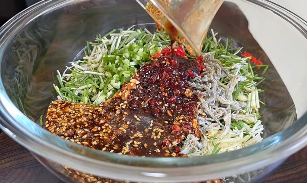 이제 양념을 만든다. 볼에 간장과 고춧가루를 먼저 섞어 색을 풀어준다. 여기에 다진 마늘과 설탕 또는 올리고당을 넣어 단맛을 더한다. 그 다음 잘게 부순 멸치를 넣고 골고루 섞는다. 마지막으로 달래를 넣고 가볍게 버무린 뒤 참기름과 깨를 넣어 마무리한다.