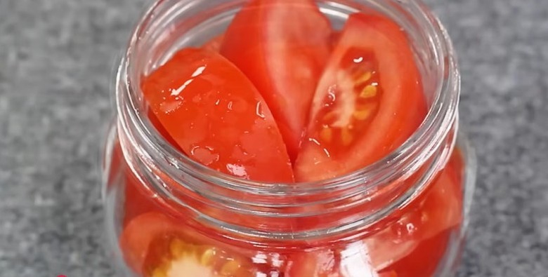 손질한 토마토는 열탕 소독한 유리병에 담는다. 유리병은 끓는 물에 5분 이상 삶거나 뜨거운 물로 충분히 헹군 뒤 완전히 건조시켜 사용하는 것이 중요하다. 이 과정은 피클의 보관 기간을 늘리고 잡균 번식을 막는 데 핵심적인 역할을 한다.