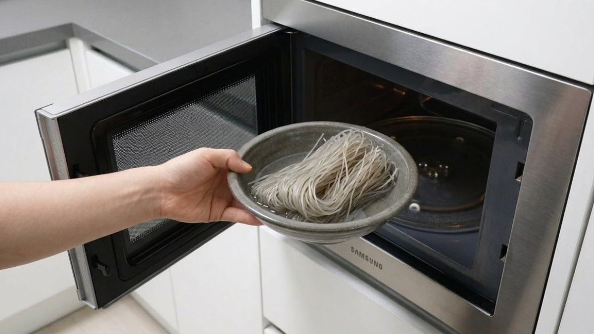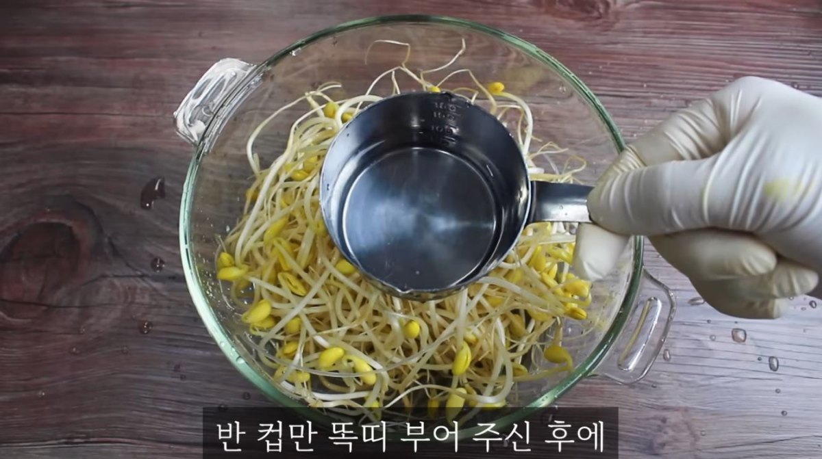 요리의 서막은 당면 100g을 물에 담가 15분간 충분히 불리는 것으로 시작한다. 부드럽게 준비된 당면을 내열 용기에 담고 그 위에 깨끗이 손질된 콩나물 200g을 얹는 과정은 조리 시간을 획기적으로 단축한다. 여기에 물 100ml(반 컵)를 부은 후 뚜껑을 덮어 전자레인지에서 5분간 가열하면 재료 본연의 수분이 유지된 채 알맞게 익은 베이스가 준비된다.