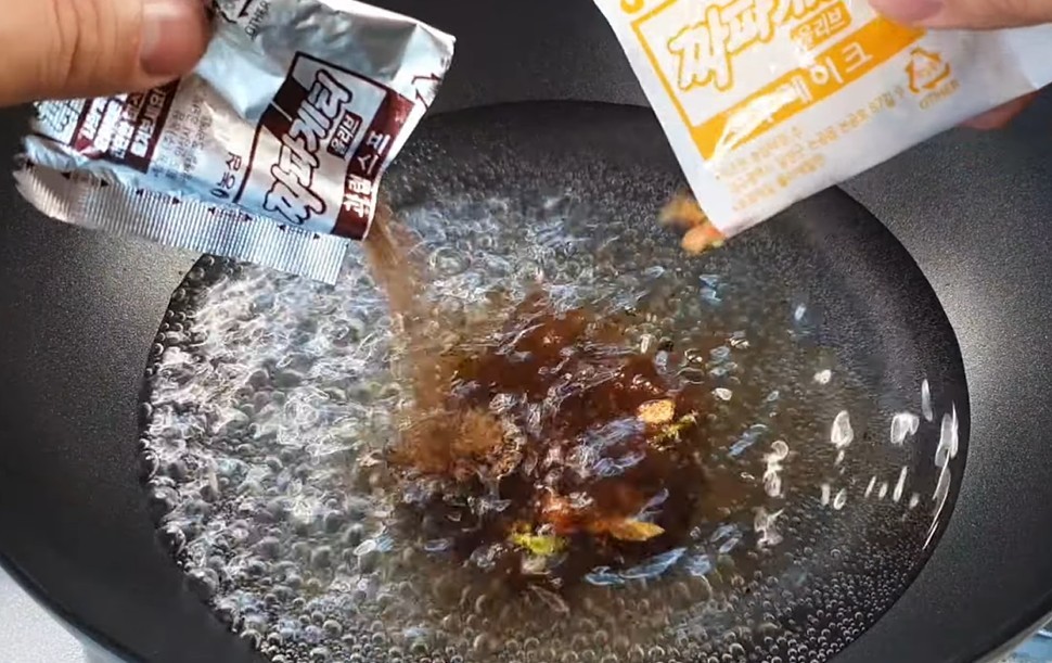 면이 절반 정도 익었을 때 분말 스프를 먼저 넣는다. 보통은 면이 다 익은 뒤 스프를 넣지만, 중간에 넣어야 전분과 소스가 함께 끓으며 자연스럽게 걸쭉해진다. 이 과정에서 면에서 나온 전분이 소스를 코팅하듯 감싸기 때문에 별도의 농도 조절 없이도 윤기 있는 짜장 소스가 완성된다.