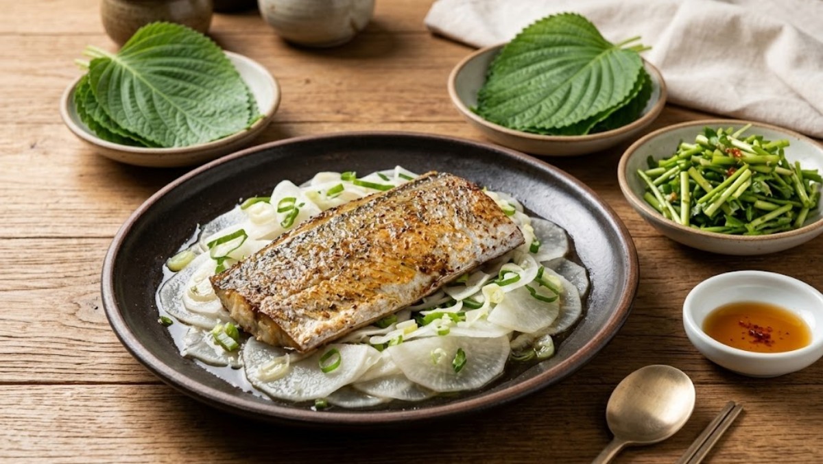 깻잎도 갈치에 곁들일 수 있다. 갈치구이를 먹을 때 깻잎에 싸서 먹으면 깻잎 특유의 향이 생선 비린내를 한 번 더 잡아준다. 깻잎은 갈치에 부족한 칼슘과 비타민 A, C를 보충해 주어 영양학적으로도 매우 우수한 조합이다. 미나리 역시 마찬가지다. 해독 작용이 뛰어난 미나리는 갈치의 고소한 기름맛을 중화해 주며, 아삭한 식감을 더해 자칫 단조로울 수 있는 생선구이의 식감을 풍성하게 살려준다.