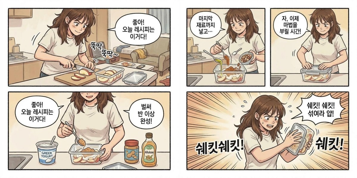 먼저 깨끗이 씻은 사과 한 개를 얇게 슬라이스하여 뚜껑이 있는 용기에 담는다. 그 위에 영양의 핵심인 그릭요거트 3스푼과 땅콩버터 1스푼, 그리고 단맛을 더해줄 알룰로스 1스푼을 차례로 올린다. 이때 알룰로스는 개인의 취향에 따라 단맛을 내는 다른 대체 감미료로 변경이 가능하다.