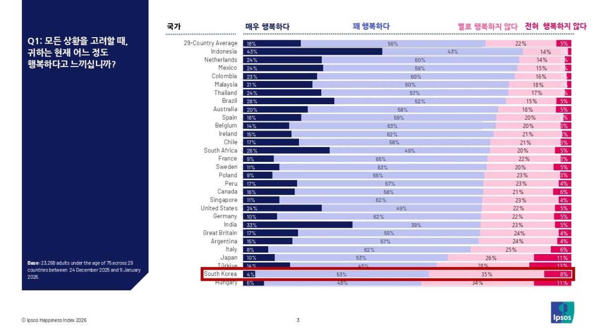 글로벌 시장조사 기업 입소스는 한국을 포함한 29개국을 대상으로 실시한 ‘2026 세계 행복 보고서’ 조사 결과 현재 행복하다고 답한 한국인 비율이 57%로 집계됐다고 19일 밝혔다.