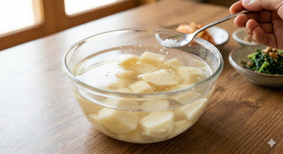 집에서 밑반찬으로 감자조림을 만들다 보면 겪게 되는 흔한 고민이 있다. 감자를 깍둑썰기해서 분명히 모양 좋게 넣었는데, 요리가 끝나고 보면 감자 모서리가 다 뭉개져 있거나 서로 달라붙어 지저분해 보이는 경우다. 심하면 숟가락으로 떠먹어야 할 정도로 형체가 사라지기도 한다. 이런 문제를 한 번에 해결할 방법이 있다. 바로 감자를 졸이기 전에 소금물에 잠깐 담가두는 것이다. 이 과정 하나만 더하면 모양이 반듯하게 살아있고 속까지 간이 잘 밴 감자조림을 만들 수 있다.