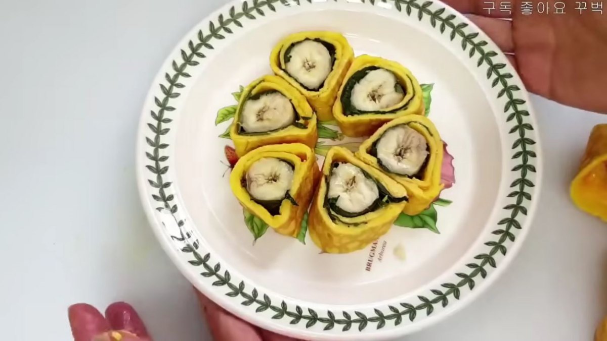 지단 위에 바나나를 바로 올리면 미끄러워 잘 말리지 않는 문제가 발생한다. 이를 해결하기 위해 깻잎을 활용한다. 깻잎의 까슬까슬한 표면이 바나나를 고정해 주는 역할을 해 안정적으로 말 수 있게 한다. 깻잎 위에 바나나를 얹고 전분 가루가 들어간 계란 지단으로 돌돌 말아주면 요리가 완성된다. 이때 깻잎의 색이 변하지 않도록 불을 아주 약하게 조절해 짧은 시간 동안 익히는 것이 중요하다.