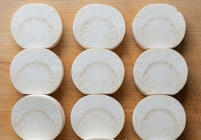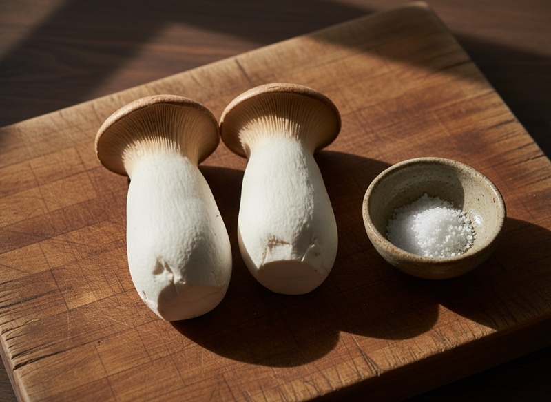 이번 요리의 핵심은 ‘버섯의 몸통만 사용한다’는 점이다. 새송이버섯 2개를 준비한 뒤 갓 부분은 제거하고, 굵고 단단한 몸통만 남긴다. 이 몸통을 길이 방향으로 0.7~1cm 정도 두께로 썰어준다. 너무 얇으면 식감이 약해지고, 너무 두꺼우면 속까지 익기 어려우므로 적당한 두께를 유지하는 것이 중요하다.