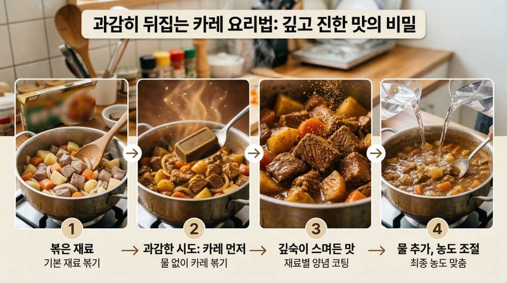 이럴 때는 조리 순서를 과감히 뒤집어보는 것이 핵심이다. 물을 넣기 전에 먼저 카레를 넣고, 재료와 함께 볶아주는 방식이다. 카레를 채소와 고기에 먼저 입혀주면 재료 하나하나에 양념이 스며들어 훨씬 깊고 진한 맛을 낼 수 있다. 이후 물을 부어 농도를 조절하는 방식이기 때문에 간을 맞추기도 훨씬 수월해진다.