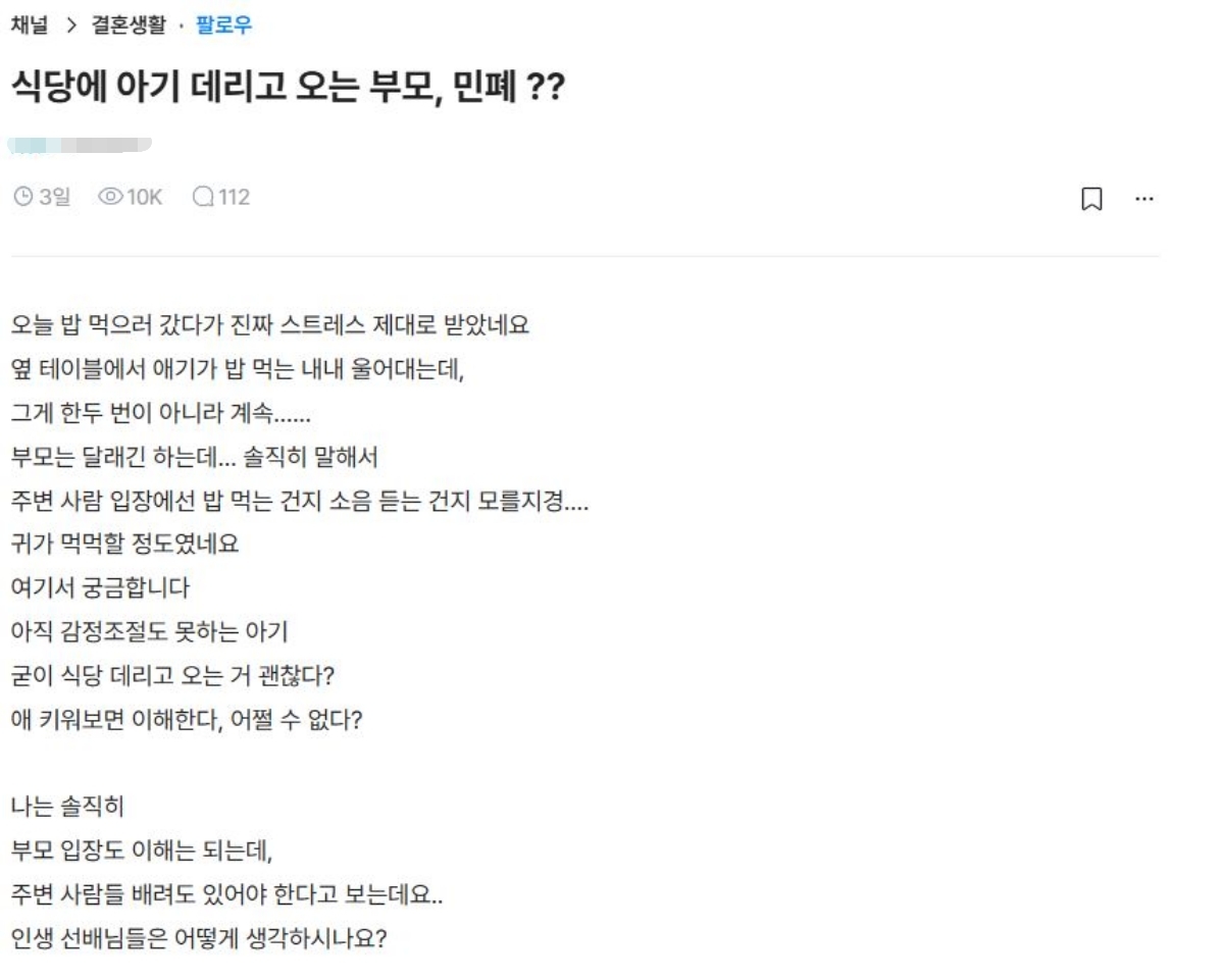 보도에 따르면 글쓴이 A 씨는 식당에서 밥을 먹던 중 옆 테이블에 있던 아이가 식사 내내 울어 큰 스트레스를 받았다고 털어놨다. 그는 “한두 번이 아니라 계속 울었다”면서 “부모가 달래기는 했지만 주변 사람 입장에서는 밥을 먹는 건지 소음을 듣는 건지 모를 정도였다”고 적었다. 이어 “귀가 먹먹할 정도였다”며 어린아이가 계속 우는 상황에서 식사를 해야 했던 당시 불편함을 전했다.