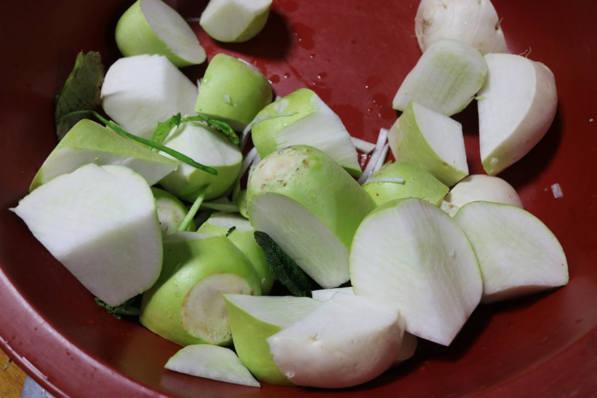 가장 먼저 준비할 것은 무다. 무는 깨끗이 씻어 준비한다. 이때 무를 써는 크기는 먹는 사람의 취향에 맞추면 된다. 치아가 약한 어르신들이 계신 집이라면 얇고 납작하게 썰어 씹기 편하게 만드는 것이 좋다. 반면 아삭아삭한 식감을 즐기는 젊은 층이나 씹는 맛을 선호한다면 손가락 굵기 정도로 굵직하게 썰어도 괜찮다.