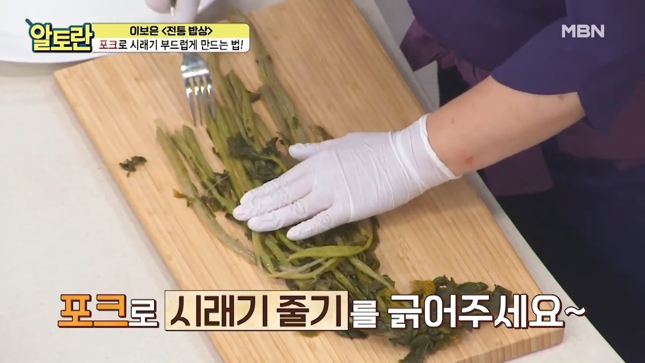 삶은 시래기의 질긴 부분을 정리하는 것은 맛을 위해 중요하다. 이때 포인트는, 충분히 삶아 부드러워진 시래기를 준비한 뒤 '포크'를 이용해 줄기 부분을 중심으로 긁어내듯 문질러주면 된다. 이 과정에서 시래기의 억센 섬유질이 자연스럽게 풀리면서 식감이 한층 부드러워진다. 동시에 겉껍질이 벗겨지는 효과도 있어, 별도의 많은 손질 없이도 먹기 좋은 상태로 만들 수 있다. 특히 줄기 쪽이 질기게 느껴졌다면 이 과정을 거치는 것만으로도 확연한 차이를 느낄 수 있다.
