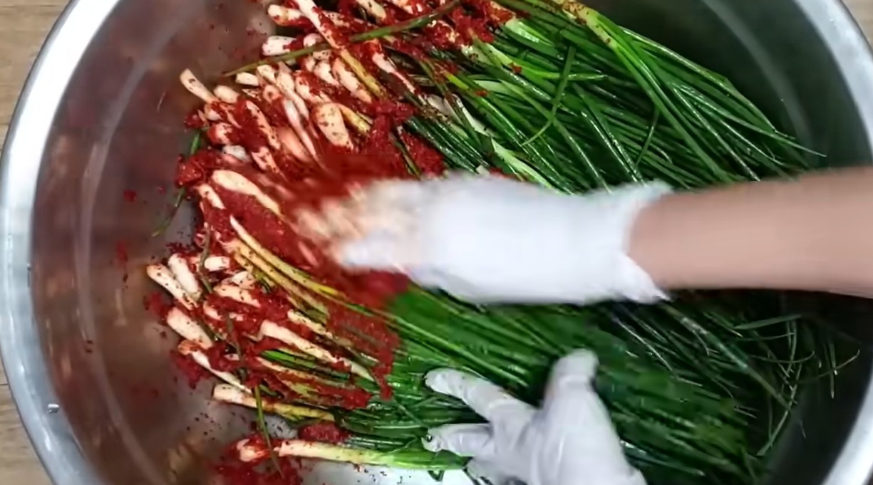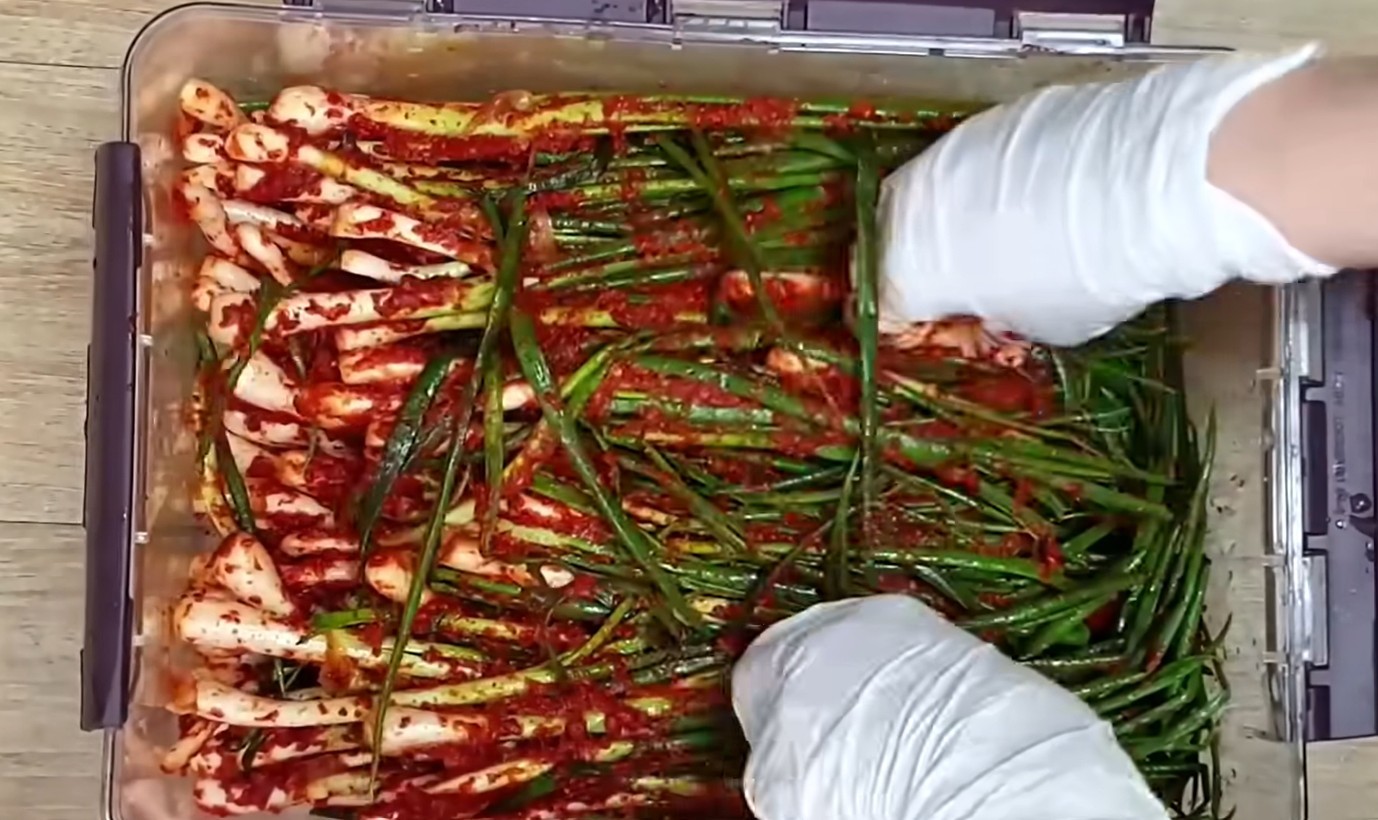 양념을 만든 뒤 절인 파에 골고루 버무린다. 이때 너무 세게 주무르기보다는 파가 부러지지 않도록 살살 섞어주는 것이 중요하다. 완성된 파김치는 바로 먹어도 좋지만, 실온에서 반나절 정도 두었다가 냉장 보관하면 맛이 훨씬 안정된다. 하루 정도 지나면 짜파게티와 가장 잘 어울리는 상태가 된다.