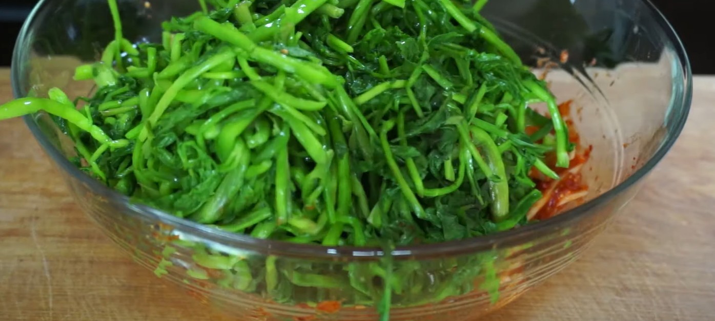 양념을 먼저 섞은 뒤 미나리를 넣고 가볍게 버무린다. 이때 너무 세게 치대면 미나리가 숨이 죽고 물이 생기기 쉬우므로, 살살 뒤집듯이 섞는 것이 좋다. 완성된 미나리김치는 바로 먹어도 좋고, 냉장고에서 반나절 정도 두면 양념이 은은하게 배어 더 깊은 맛을 느낄 수 있다.