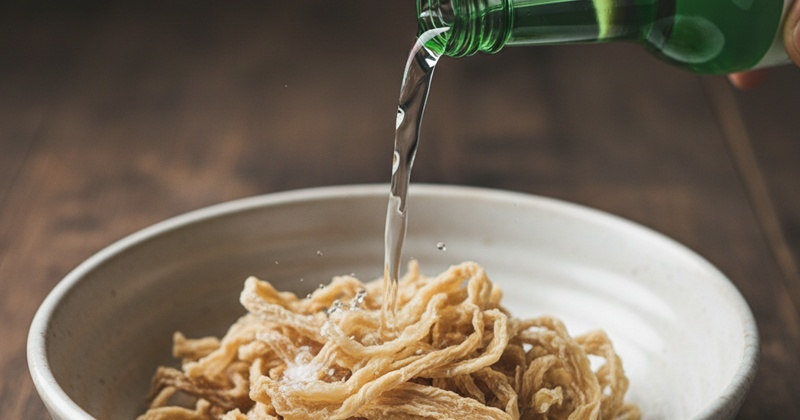 사용 방법은 간단하다. 먼저 무말랭이를 흐르는 물에 가볍게 헹궈 먼지를 제거한 뒤, 물기를 살짝 털어낸다. 이후 소주를 한두 스푼 정도 골고루 뿌려 5~10분 정도 둔다. 이때 소주에 완전히 담그기보다는 가볍게 적시는 수준이 적당하다. 이후 물이나 육수로 한 번 더 불리면 식감이 훨씬 자연스럽게 살아난다.