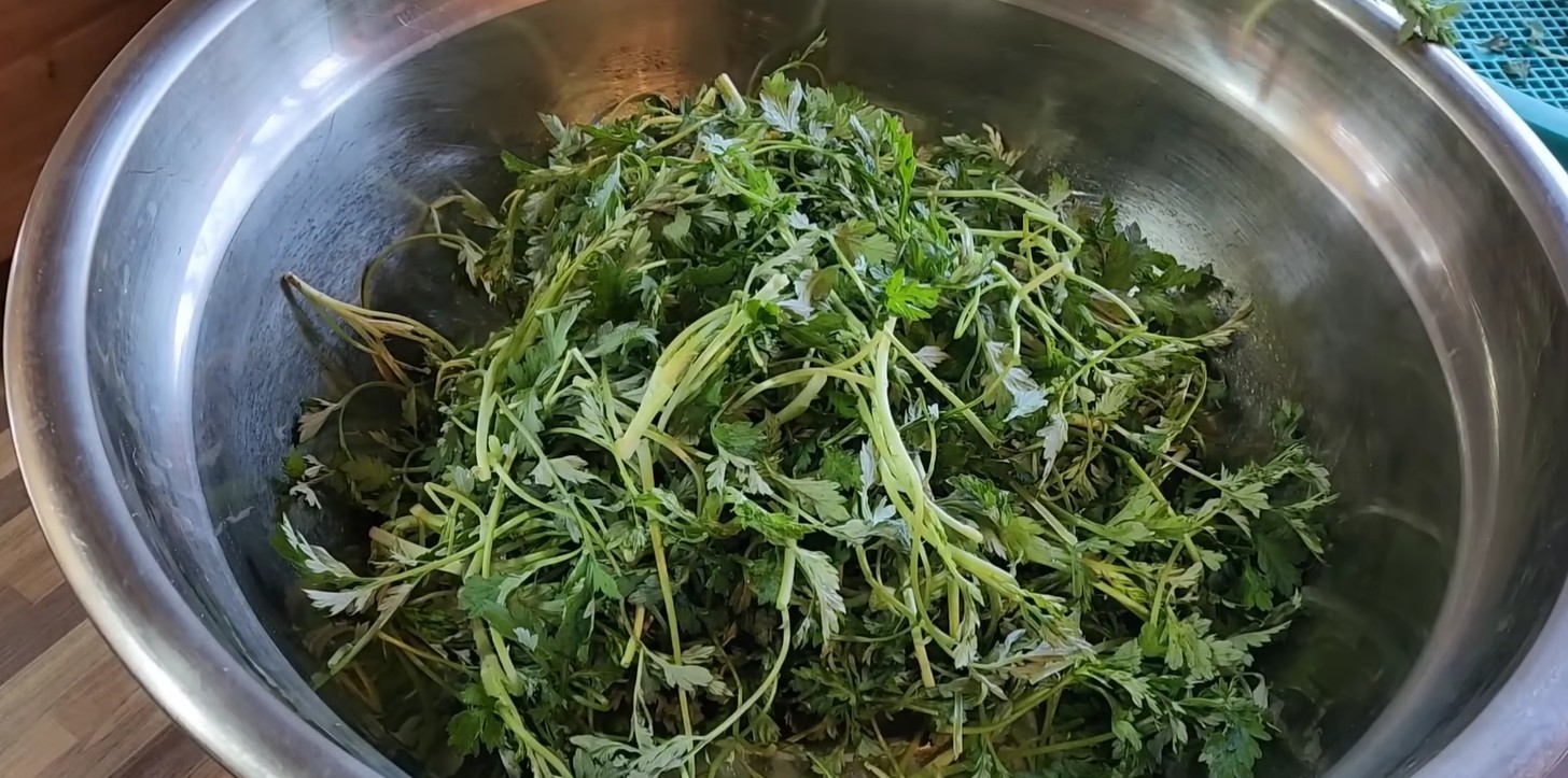 쑥부각의 핵심은 ‘전처리’다. 먼저 질겨진 쑥을 준비해 깨끗이 씻은 뒤, 끓는 물에 소금을 약간 넣고 짧게 데친다. 이 과정은 쑥의 질긴 섬유를 어느 정도 부드럽게 만들고, 쓴맛을 줄이는 역할을 한다. 데친 쑥은 찬물에 헹궈 색을 살린 뒤 물기를 꼭 짜준다.