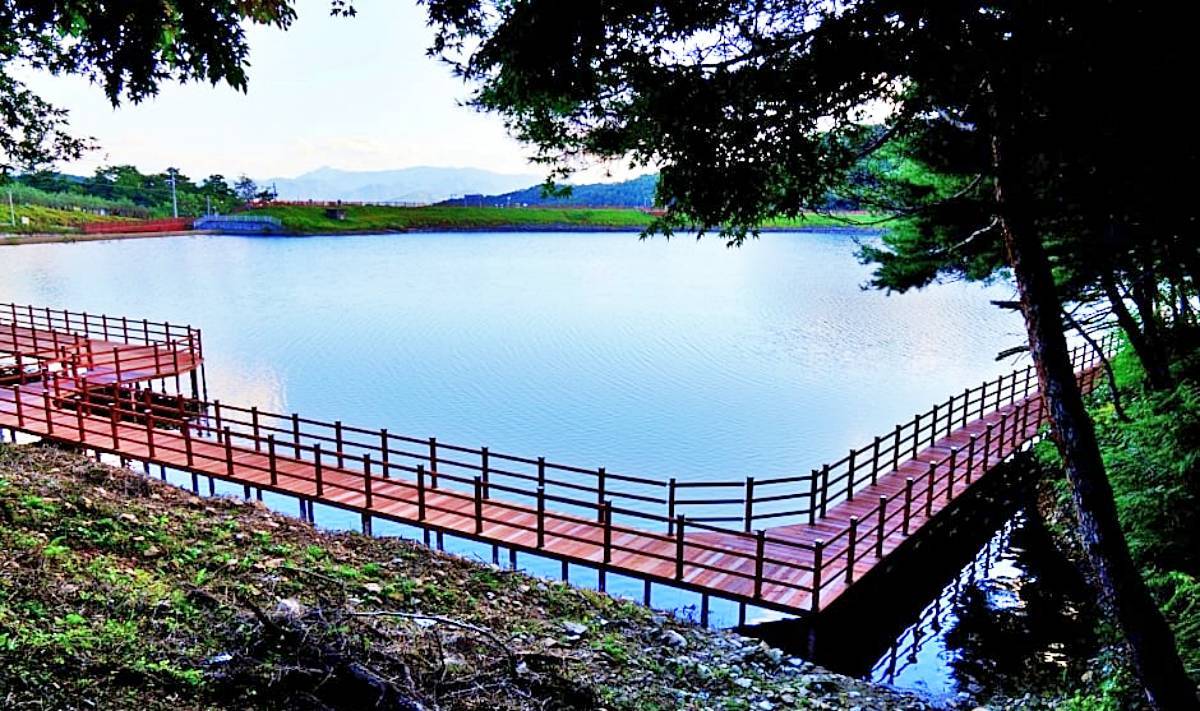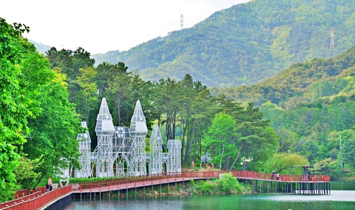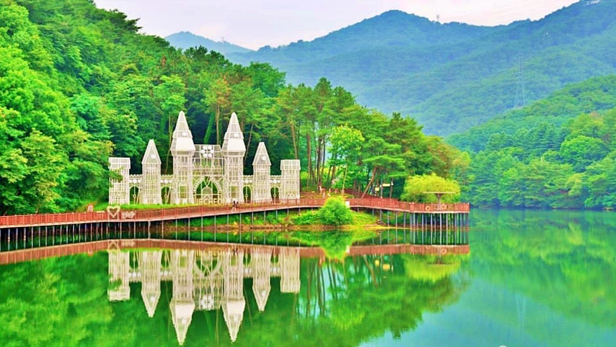 저물어가는 노을 아래 고요한 숲을 걷다 보면 현실과는 조금 동떨어진 풍경을 마주하게 된다. 충북 제천에 위치한 비룡담 저수지는 ‘제2의림지’로 잘 알려진 곳으로, 이국적인 풍경을 찾는 이들 사이에서 주목받는 장소다. 울창한 숲에 둘러싸인 저수지 수변에 성곽 모양의 조형물이 우뚝 솟아 있어 독특한 분위기를 자아낸다. 정적인 자연 속에서 마주하는 이색적인 건축물이 주는 차분한 매력이 돋보이는 곳이다.