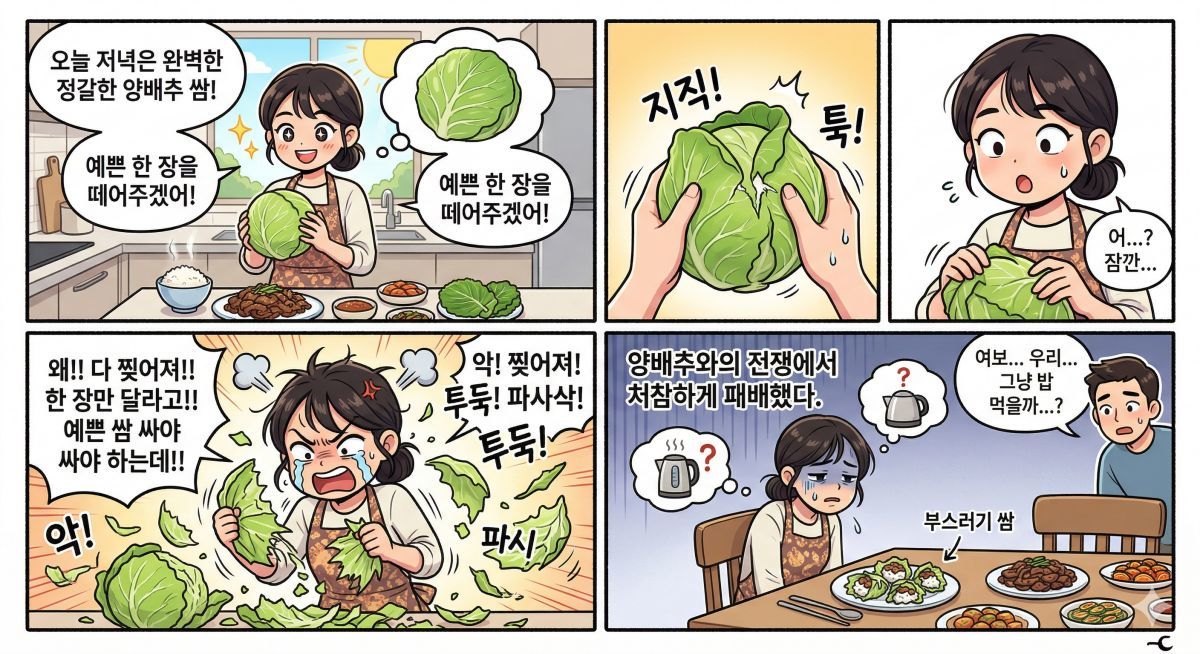 셋째, 신선한 양배추일수록 세포 안에 수분이 꽉 차 세포벽이 팽팽하다. 이 아삭함이 먹을 때는 장점이지만 떼어낼 때는 단점이 된다. 유연성이 부족해 조금만 힘을 주면 휘어지지 않고 바로 부러지거나 찢어진다. 뜨거운 물이 이 세 가지 문제를 동시에 해결한다. 열이 잎 사이의 압착을 풀고 심지와의 연결 부위를 부드럽게 만들며 세포벽의 경직성을 낮춰주는 원리다.