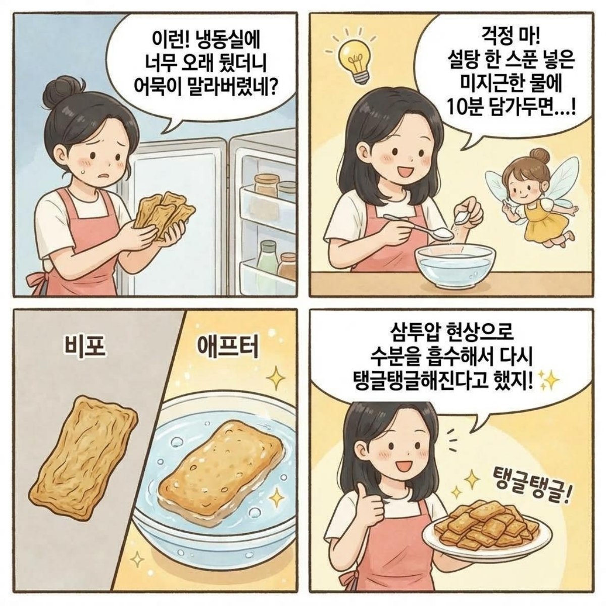 어정쩡하게 남은 어묵을 보관할 때는 표면에 식용유를 살짝 발라 밀폐 용기에 담으면 수분 증발을 막아 딱딱해지는 것을 방지할 수 있다. 만약 냉동실에 오래 보관하여 마른 어묵이 있다면, 조리 전 설탕 한 스푼을 넣은 미지근한 물에 10분 정도 담가두면 삼투압 현상에 의해 수분이 빠르게 흡수되어 다시 탱글탱글한 식감으로 돌아온다.