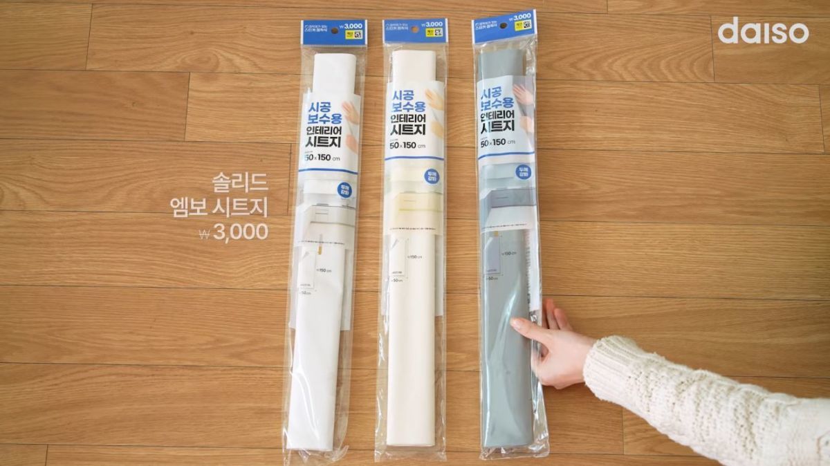 먼저 소개된 제품은 엠보 패턴 시트지다. 이 제품은 표면이 오돌토돌한 질감으로 처리돼 고급스러운 분위기를 연출할 때 활용하기 좋다. 화이트, 베이지, 그레이 세 가지 컬러로 출시된 '시공보수용 솔리드엠보 시트지(50X150cm)'는 3000원에 구매할 수 있다. 사용법은 간단하다. 원하는 크기만큼 잘라 뒷면의 이형지만 제거해 원하는 곳에 붙이면 끝이다.