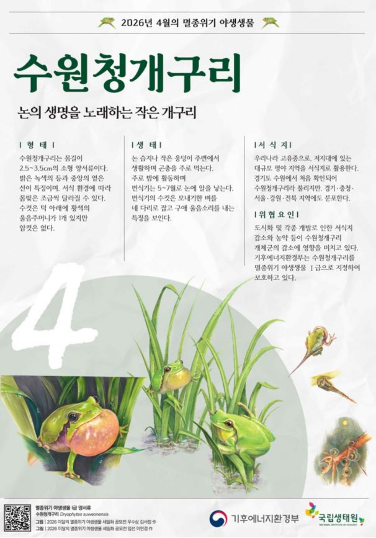 지난 2일 기후에너지환경부가 우리나라에서만 찾아볼 수 있는 고유종 ‘수원청개구리’를 4월의 멸종위기 야생생물로 선정했다. 수원청개구리는 국내 양서류 중 최초로 멸종위기 야생생물 1급으로 보호받기 시작한 종이다. 최근 도심 확장과 각종 개발 사업으로 인해 서식 환경이 악화하면서 개체군 유지를 위한 체계적인 보전 대책이 필요한 상황이다.