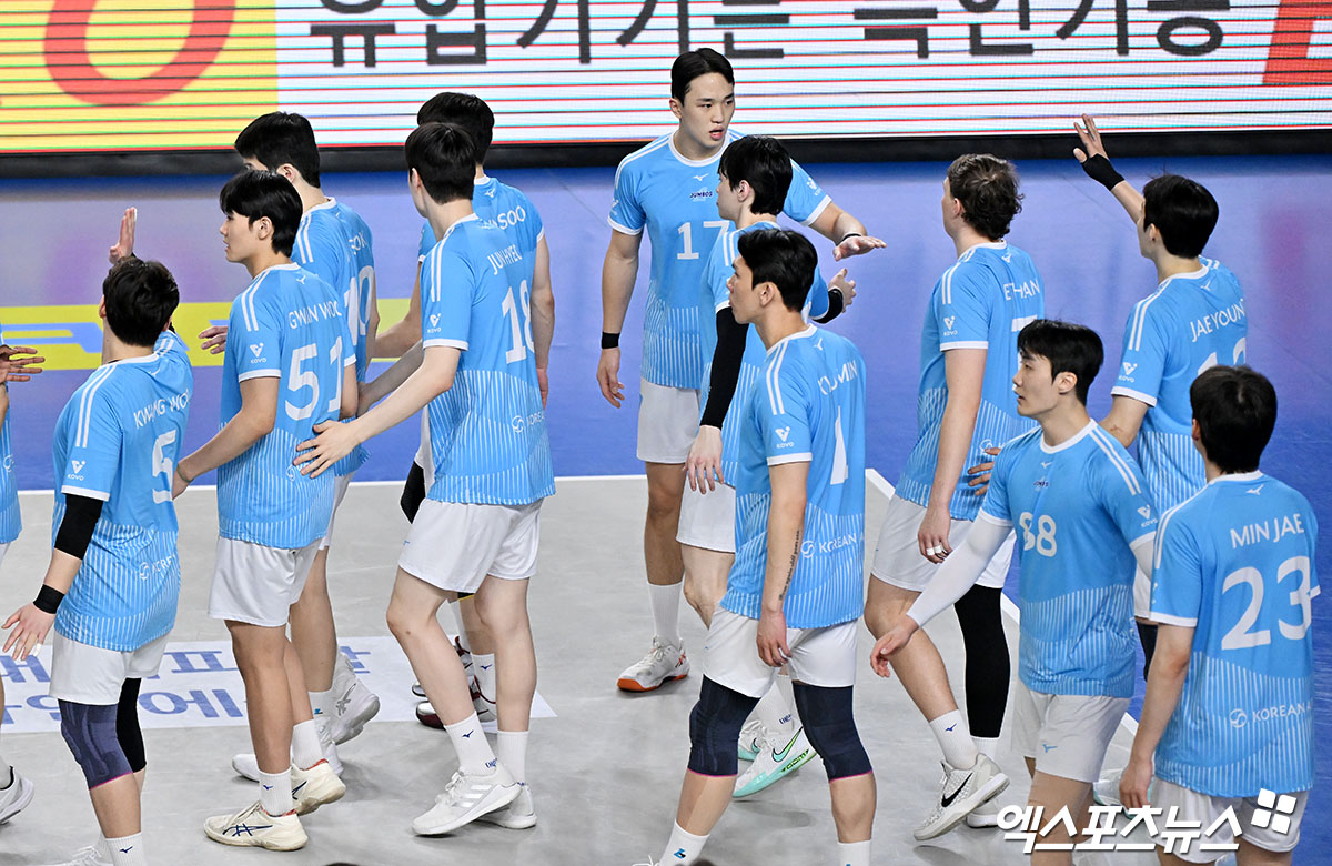 아쉬워하는 대한항공 선수들[포토]