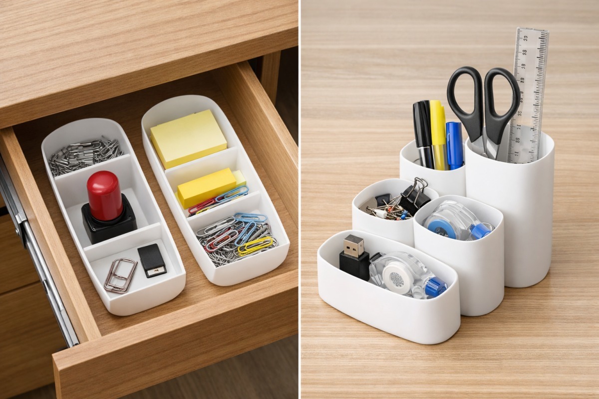 특히 용기를 한 개만 사용하는 것이 아니라, 서로 다른 높이로 3~4개를 잘라 본드로 붙여 '계단식 수납함'을 만들면 활용도가 더욱 높아진다. 가장 낮은 칸에는 쉽게 잃어버리는 USB 메모리, 클립, 수정테이프 등을 담고, 높은 칸에는 긴 자나 가위를 꽂아 시각적으로 한눈에 들어오는 맞춤형 오거나이저를 구성할 수 있다. 플라스틱 재질 특성상 잉크가 묻어도 물티슈로 쉽게 닦아낼 수 있어 위생적인 관리가 가능하다.