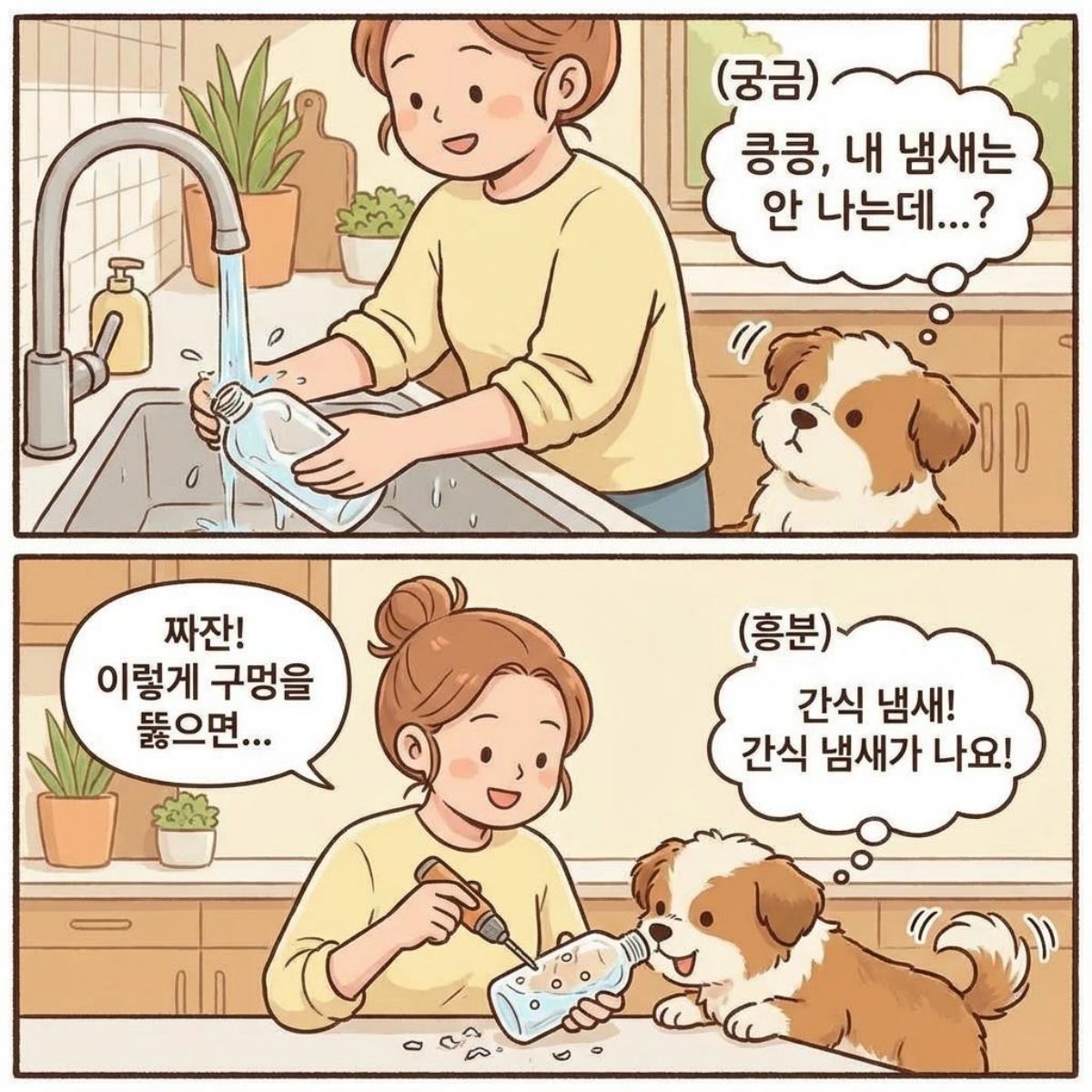 반려동물을 키우는 가구에서는 이 플라스틱 병을 '노즈워크(Nose Work)' 장난감으로 재탄생시킬 수 있다. 깨끗이 세척한 용기 측면에 반려동물의 간식이 겨우 빠져나갈 정도의 구멍을 여러 개 뚫는다. 용기 안에 간식을 넣고 뚜껑을 닫아 바닥에 두면, 반려동물이 용기를 굴릴 때마다 간식이 조금씩 나와 지능 발달과 놀이에 도움을 준다.