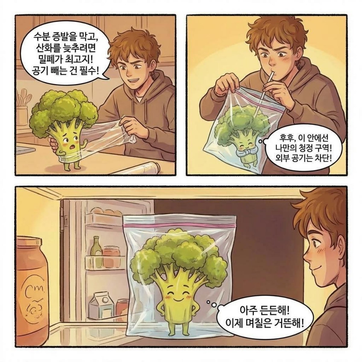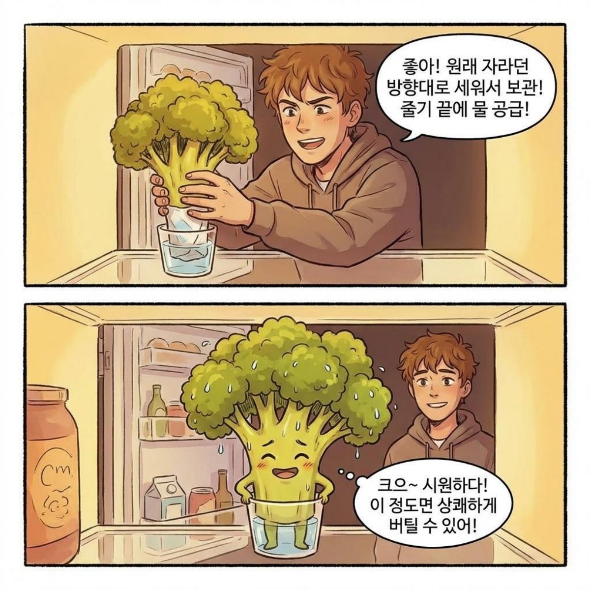 브로콜리는 원래 자라던 방향대로 세워서 보관하는 것이 신선도 유지에 유리하다. 줄기 끝부분을 물에 적신 키친타월로 감싸거나, 물이 조금 담긴 컵에 꽂아 냉장 보관하면 수분 공급을 지속할 수 있다.