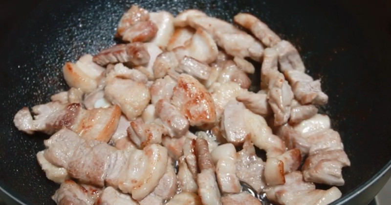 삼겹살이 어느 정도 익으면 마늘과 양파를 넣고 함께 볶는다. 이 단계에서도 불은 중강불을 유지해 수분이 빠르게 날아가도록 하는 것이 좋다. 이후 양념을 넣고 고기와 채소에 골고루 배이도록 섞는다. 마지막으로 콩나물을 넣고 빠르게 볶아내는데, 이때가 가장 중요하다.