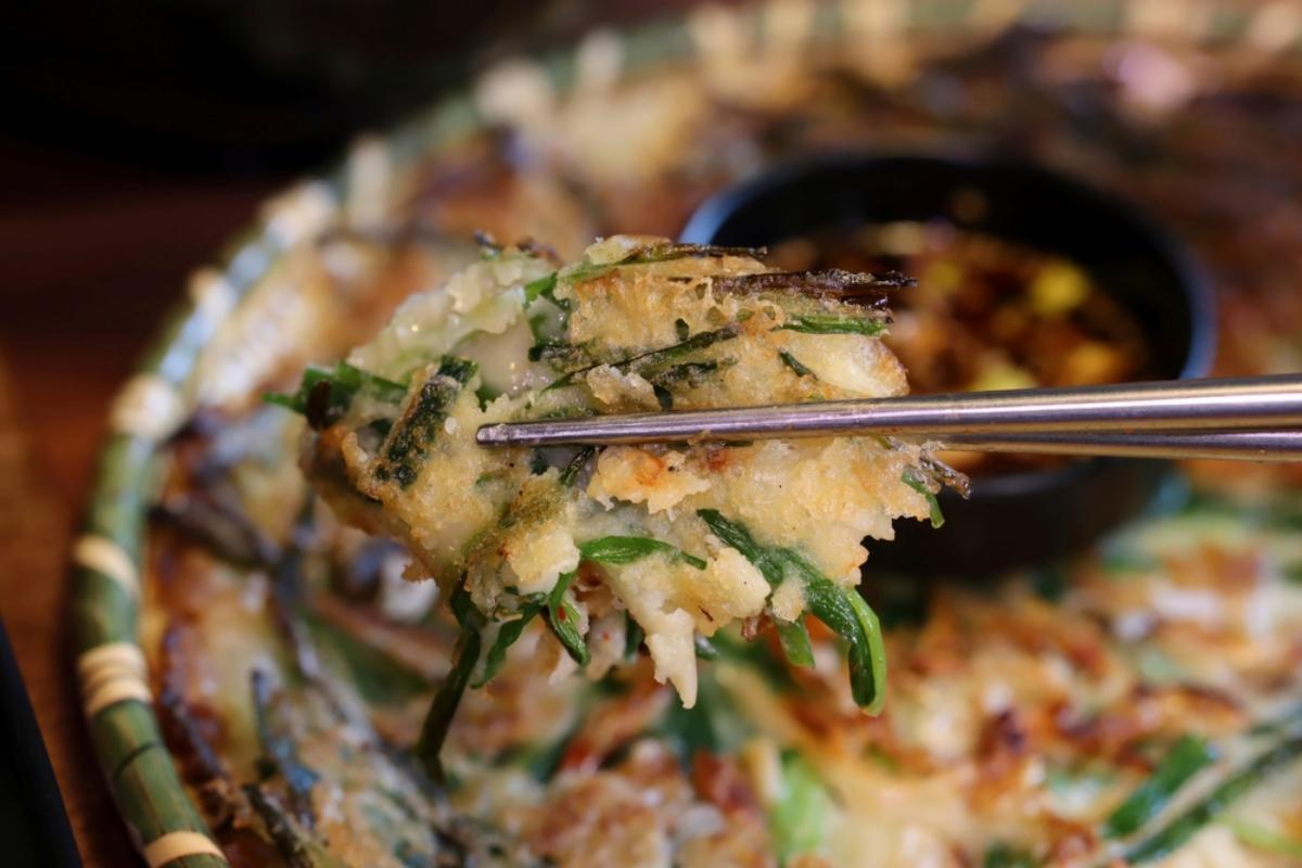 구멍을 뚫고 나서 다시 1분 정도 충분히 익힌다. 앞뒤로 노릇노릇한 갈색빛이 돌면 전이 완성된 것이다. 다 구워진 전은 접시에 바로 담기보다 식힘망 위에 잠시 올려두면 아래쪽에 습기가 차는 것을 막아 바삭함을 더 오래 유지할 수 있다. 이렇게 정성 들여 부친 부추전은 마늘의 진한 향과 액젓의 감칠맛, 그리고 전분이 만들어낸 바삭함이 조화를 이룬다.