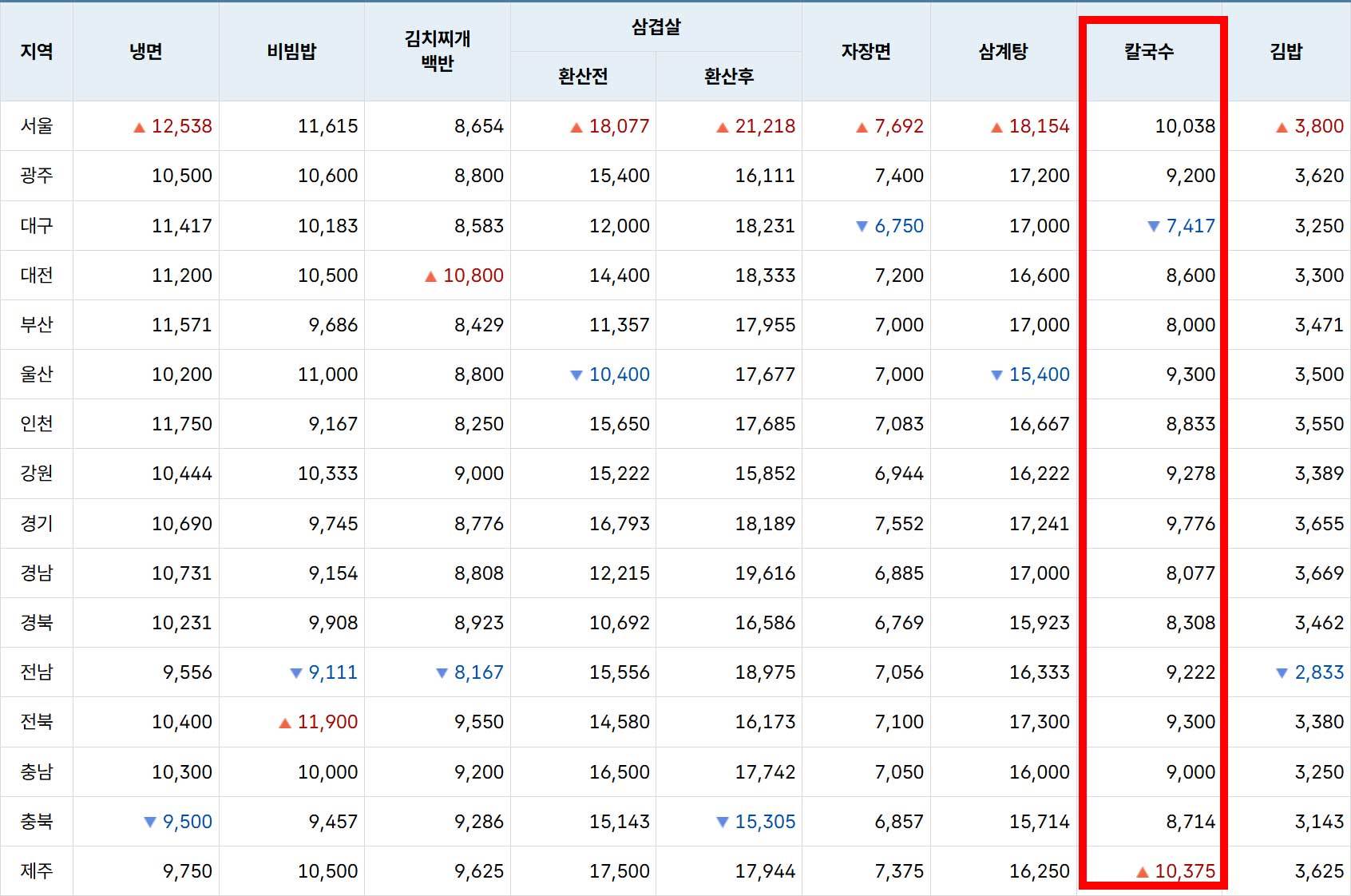 전국 16개 지역 데이터를 보면 지역마다 가격 편차가 상당하다. 칼국수의 경우 제주(1만375원)가 서울(1만38원)보다 오히려 비쌌다. 반면 대구는 7417원, 충북은 8714원으로 서울과 2000~3000원 가까이 차이가 났다. 같은 칼국수 한 그릇인데 지역에 따라 가격이 40% 가까이 벌어지는 셈이다.