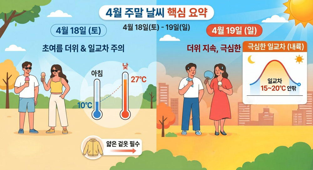 토요일 18일은 전국적으로 낮 기온이 크게 오르며 초여름처럼 다소 더운 날씨를 보이겠다. 다만 아침과 낮의 기온 차가 크게 벌어져 건강 관리에 주의가 필요하다.