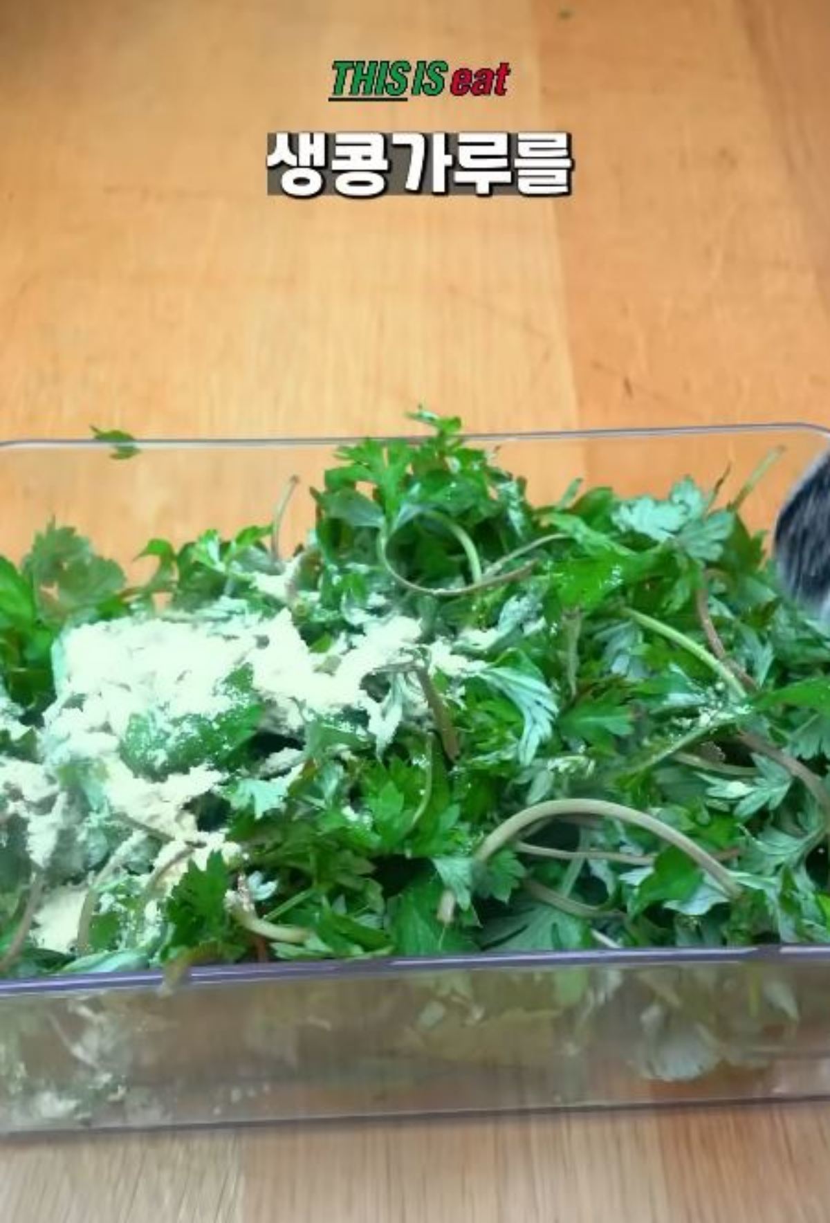 이번 보관법의 핵심 비결은 바로 ‘생 콩가루’에 있다. 물기를 제거한 쑥을 손으로 먹기 좋게 뜯어준 뒤, 그 위에 생 콩가루를 골고루 뿌려주는 방식이다. 콩가루는 쑥의 향이 날아가지 않도록 잡아주는 코팅제 역할을 하며, 나중에 요리했을 때 고소한 맛까지 배가시킨다.