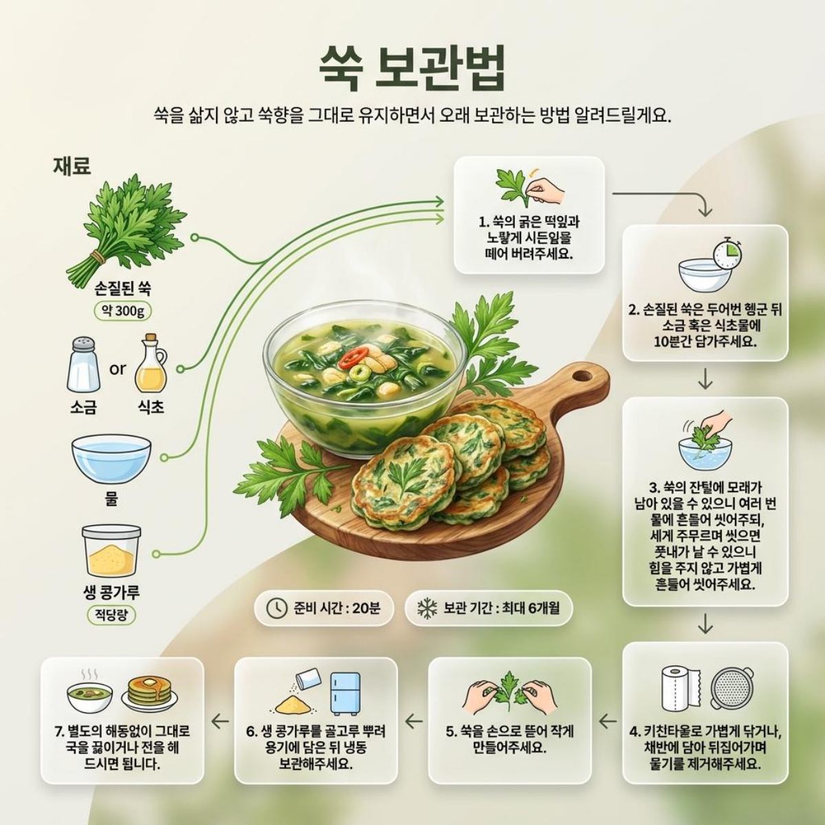 주의할 점은 세척 방식에 있다. 쑥은 표면에 잔털이 많아 모래가 끼기 쉬운데, 이를 제거하겠다고 강하게 주무르면 잎이 상해 ‘풋내’가 올라올 수 있다. 따라서 물속에서 가볍게 흔들어 씻는 것이 핵심이다. 세척 후에는 키친타월로 누르거나 채반을 활용해 수분을 충분히 제거해야 냉동 시 얼음 결정이 생기는 것을 방지할 수 있다.