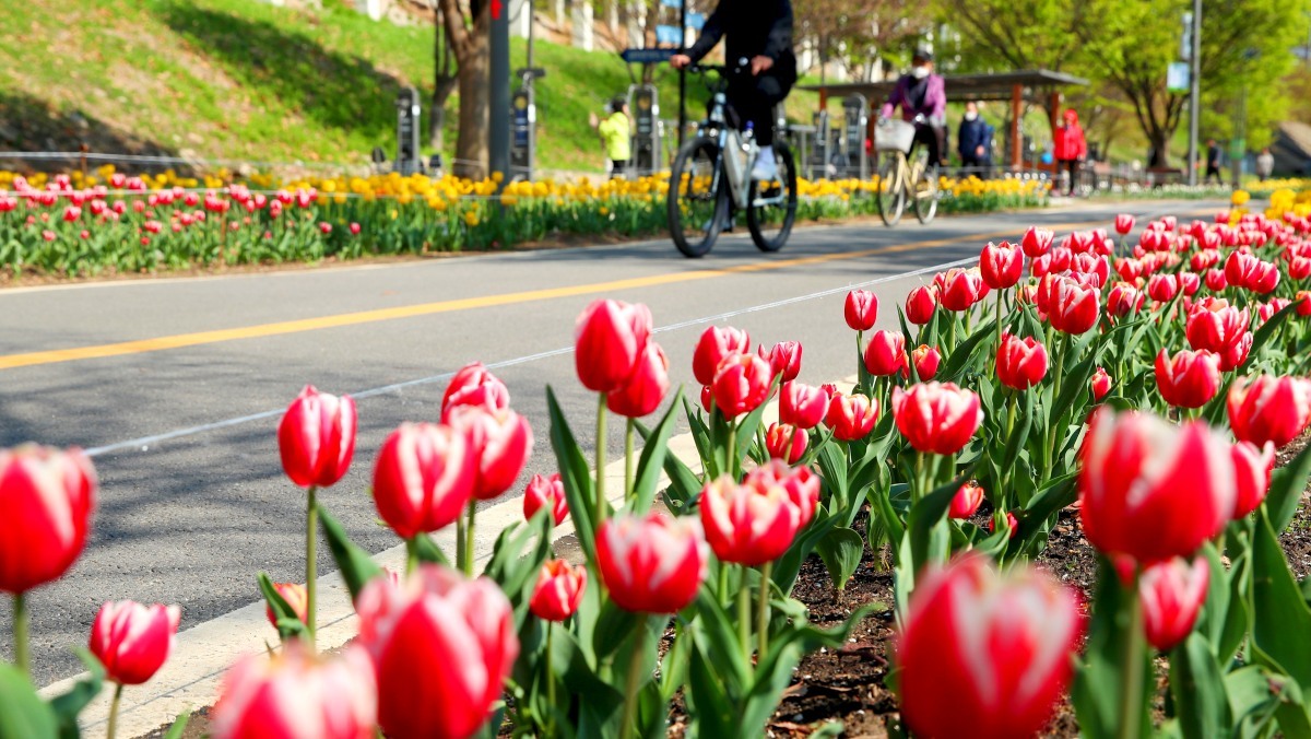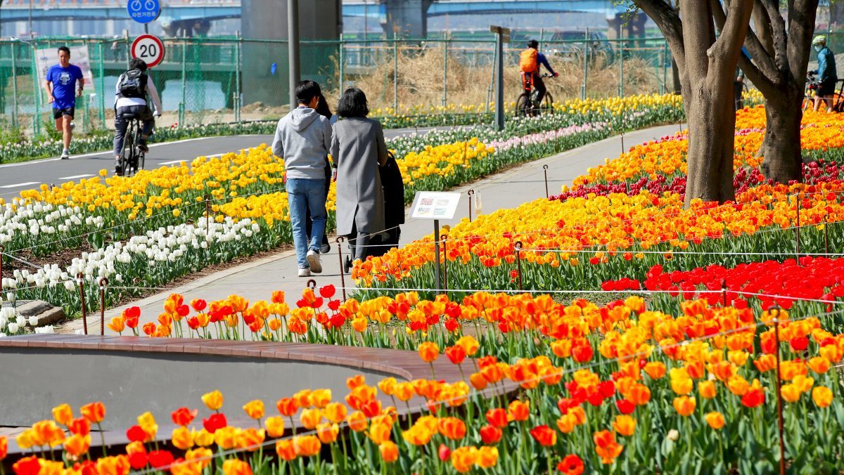 성동구는 봄을 맞아 중랑천 산책로 일대를 새로 단장했다고 지난 14일 밝혔다. 구는 지난해 11월 2.2㎞에 이르는 중랑천 산책로 구간에 튤립과 수선화 등 식물 20종 15만구를 심었다.