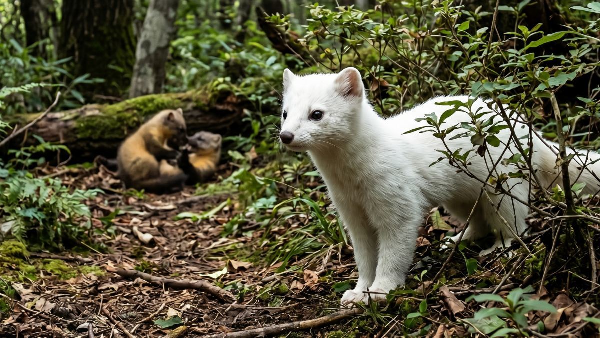 흰담비의 자태는 아름답지만, 그 이면에는 야생의 혹독한 생존 게임이 숨어 있다. 보통의 노란목도리담비가 녹색 잎이나 갈색 흙 사이에서 몸을 숨기기 좋은 보호색을 가진 것과 달리 흰담비는 숲 어디서든 눈에 띄는 치명적인 약점을 안고 태어난다. 포식자에게는 표적이 되기 쉽고, 사냥감에게는 자신의 접근을 미리 알리는 꼴이 된다. 그럼에도 불구하고 이 흰담비가 성체로 자라나 새끼까지 길러냈다는 것은 일반적인 담비보다 훨씬 뛰어난 사냥 기술과 위기감지 능력을 갖췄음을 시사한다. 이는 단순히 운이 좋아서가 아니라 유전적 결함을 개체 특유의 민첩함과 영리함으로 극복해낸 야생의 승리다.