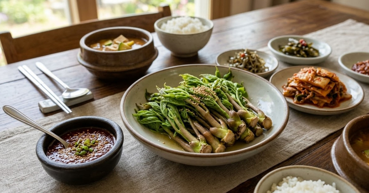 두릅 본연의 향과 아삭한 식감을 가장 온전하게 즐길 수 있는 방식인 숙회는 온도와 시간의 정밀한 조절이 핵심이다. 냄비에 물을 넉넉히 붓고 소금을 한 큰술 넣어 끓인 뒤, 단단한 밑동부터 끓는 물에 넣어 약 30초간 먼저 익히는 과정이 필수적이다. 이후 잎 부분까지 모두 담가 전체적으로 선명한 초록색이 돌 때까지 1분 내외로 빠르게 데쳐내야 영양소 파괴를 최소화하고 특유의 식감을 살릴 수 있다. 건져낸 두릅은 즉시 차가운 얼음물에 담가 잔열을 식혀야 색이 변하지 않으며, 물기를 지그시 눌러 짠 뒤 초고추장에 찍어 먹으면 쌉싸름한 맛과 새콤달콤한 양념이 완벽한 조화를 이룬다.