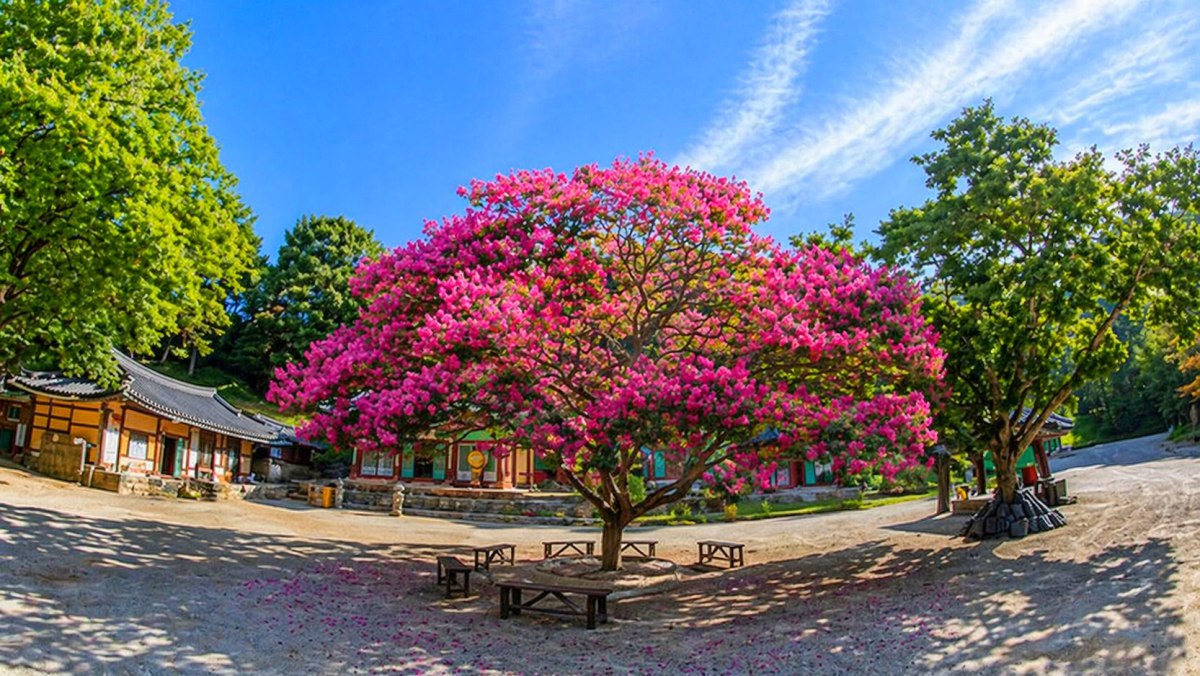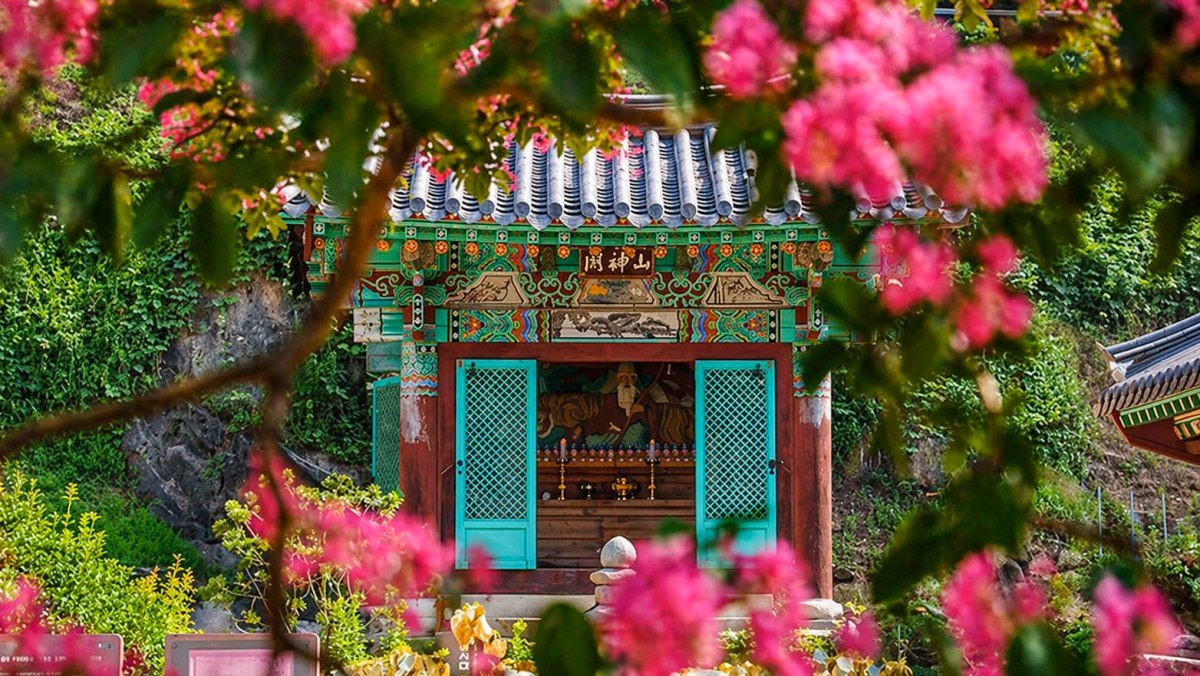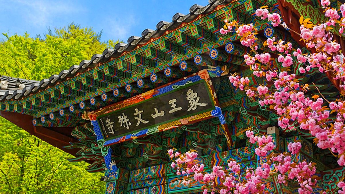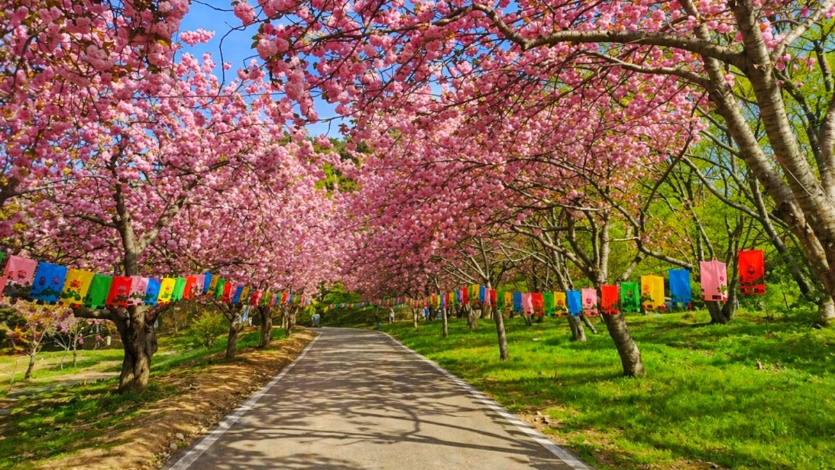 충남 서산의 깊은 산세 속에 자리 잡은 문수사는 이맘때쯤 가장 화려한 풍경을 자랑한다. 일반적인 벚꽃이 지고 나면 뒤늦게 꽃망울을 터뜨리는 겹벚꽃이 사찰을 가득 채운다.