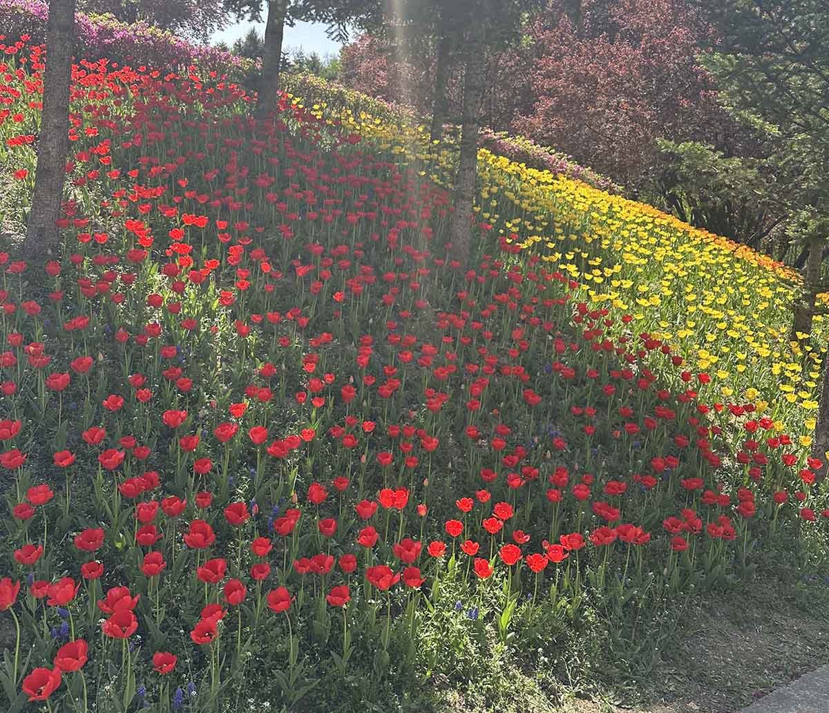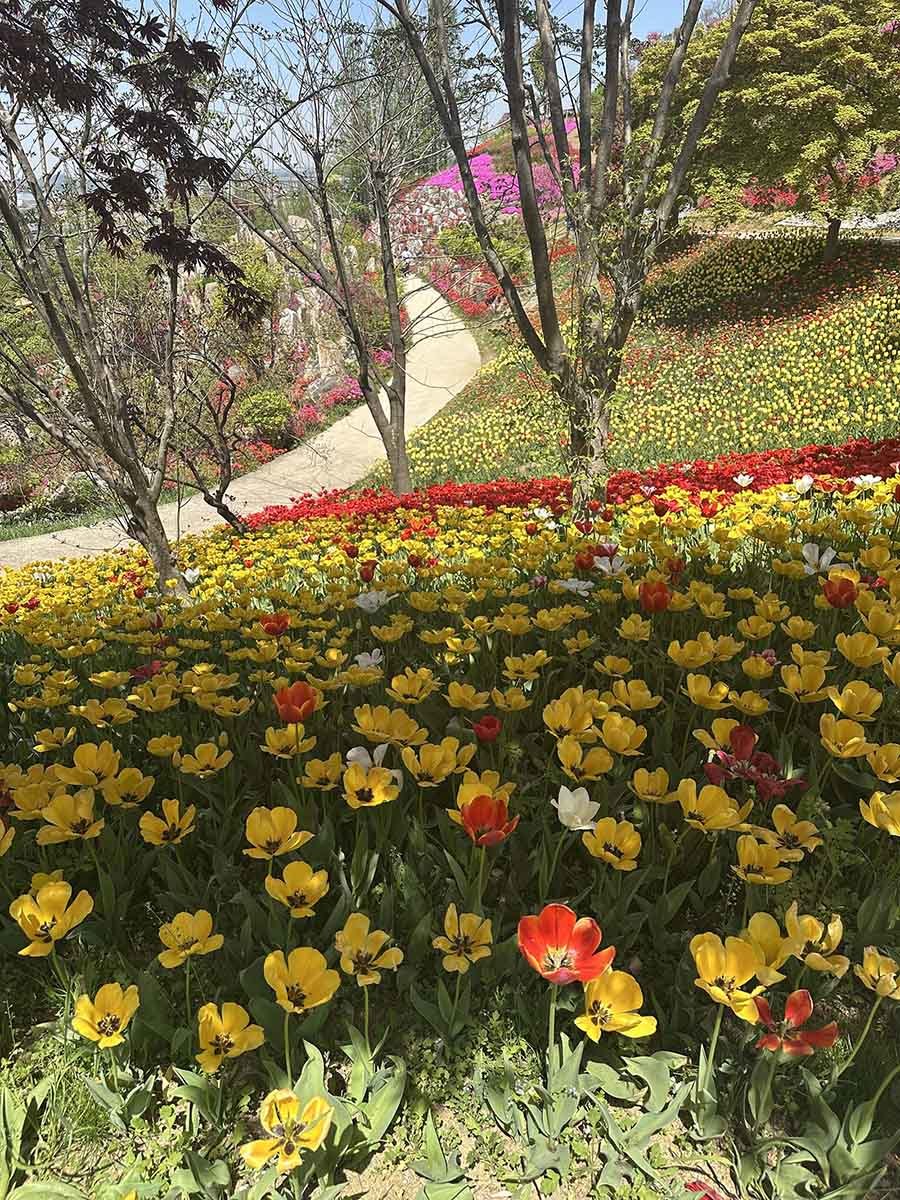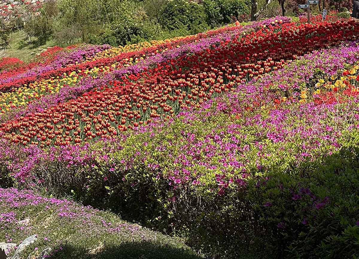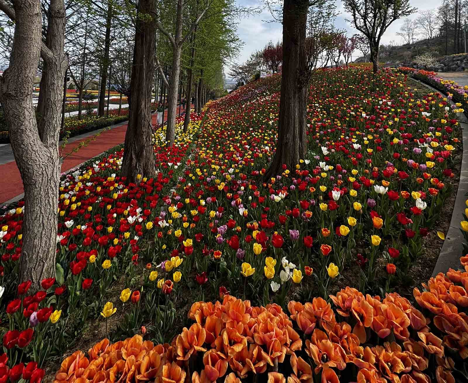 원형 정원과 잔디광장 일대는 품종별로 구역을 나눠 심어진 튤립들이 각자 색깔과 높이를 뽐내며 늘어서 있다. 단순히 빨간색, 노란색만 있는 게 아니다. 연분홍, 살몬, 코랄, 자주, 짙은 보라, 크림색, 두 가지 색이 섞인 복색 품종까지. 어느 방향으로 카메라를 들어도 보정이 필요 없는 사진이 나온다. SNS용 명소라는 말이 전혀 과장이 아니다.