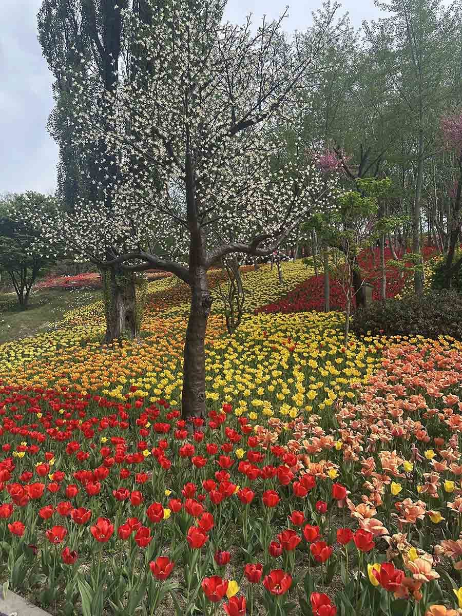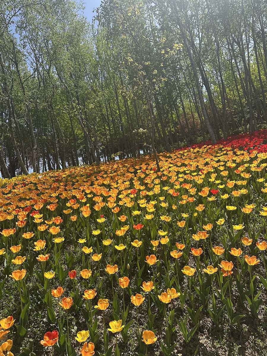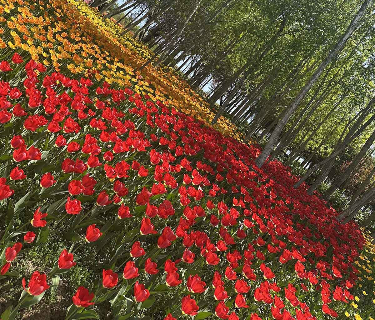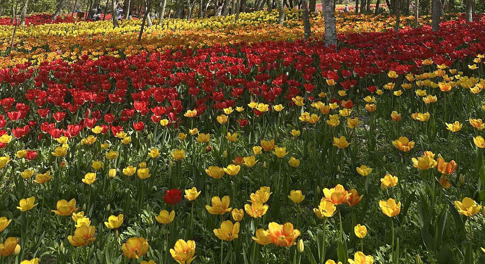 원형 정원과 잔디광장 일대는 품종별로 구역을 나눠 심어진 튤립들이 각자 색깔과 높이를 뽐내며 늘어서 있다. 단순히 빨간색, 노란색만 있는 게 아니다. 연분홍, 살몬, 코랄, 자주, 짙은 보라, 크림색, 두 가지 색이 섞인 복색 품종까지. 어느 방향으로 카메라를 들어도 보정이 필요 없는 사진이 나온다. SNS용 명소라는 말이 전혀 과장이 아니다.