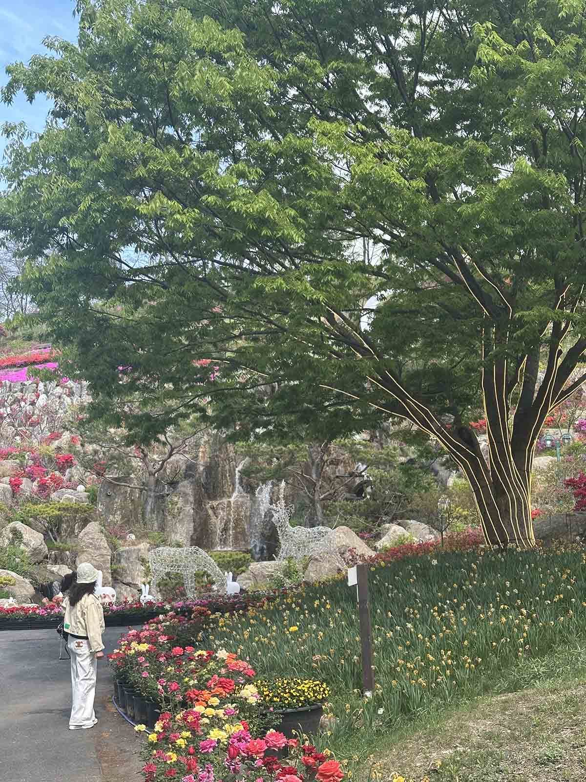 바위 절벽 사이로 쏟아지는 달빛폭포, 높은 곳에서 아산만까지 내려다보이는 전망대, 그리고 수목원 중심부를 가득 채운 꽃 정원들. 이 극적인 지형 차이가 피나클랜드를 단순한 꽃밭이 아니라 하나의 '경험'으로 만든다. 오르막이 있고 내리막이 있고, 터널처럼 이어지는 산책로가 있다. 한 켠에 '고진감래 길'이라는 구간이 있을 정도다. 이름처럼 힘들게 오른 뒤에 만나는 전망이 달빛처럼 쏟아진다.