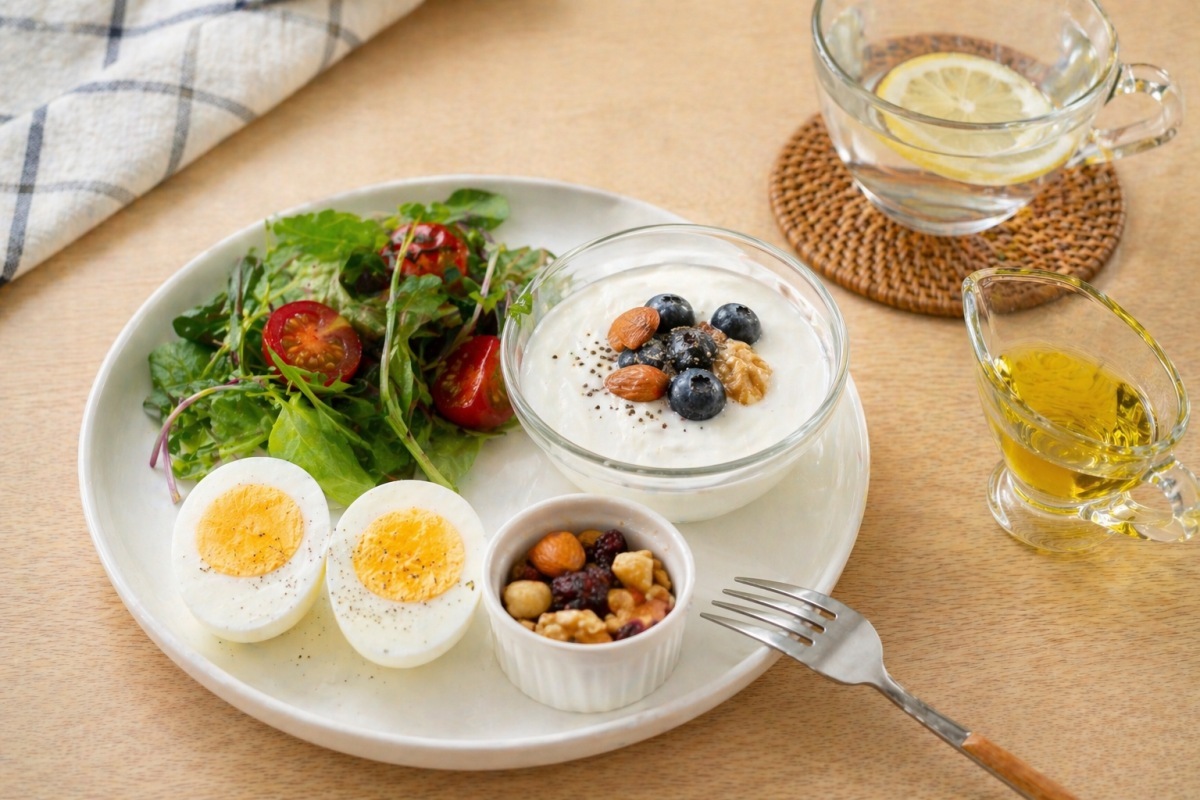 삶은 달걀 2개, 무설탕 요거트, 견과류 한 줌은 가장 완벽한 아침 식단이다. 단백질은 체온을 높이는 식이성 발열 효과(TEF)가 탄수화물보다 훨씬 높아 아침 대사량을 끌어올린다.