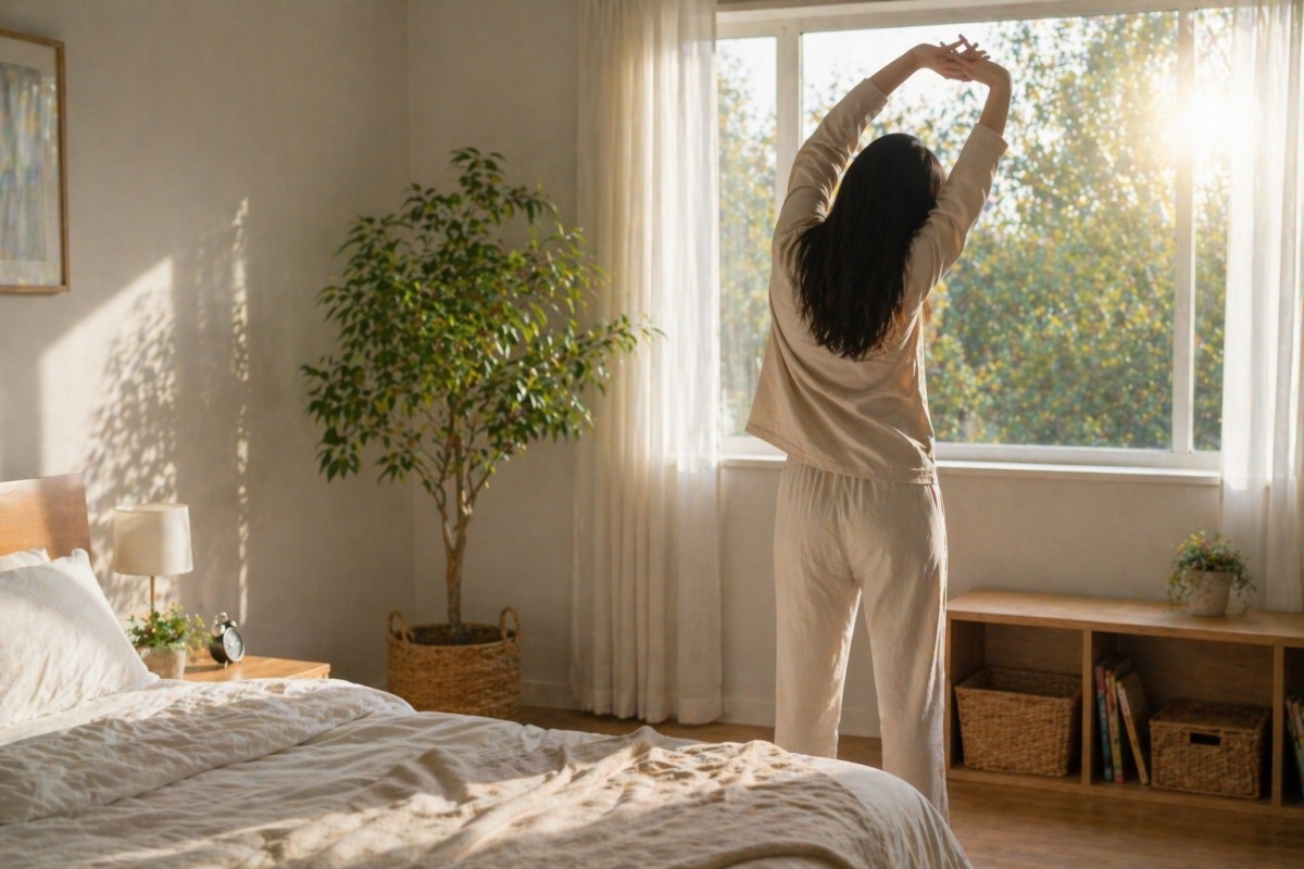 이를 '코르티솔 각성 반응(CAR)'이라 하며, 아침의 적절한 코르티솔 수치는 낮 동안의 에너지를 유지하고 밤에 멜라토닌이 제때 분비되도록 돕는다. 흐린 날이라도 실내 조명보다 외부의 자연광이 최소 10배 이상 강하므로, 창문을 열거나 밖으로 나가 10분 정도 머무는 것이 권장된다.