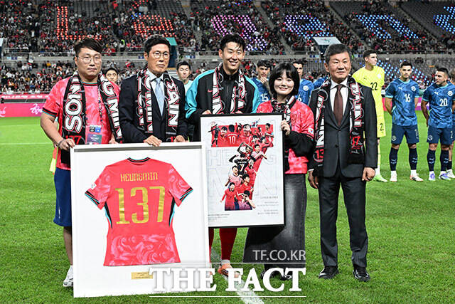 [더팩트ㅣ서울월드컵경기장=남용희 기자] 한국 남자 선수 A매치 최다 출전(137경기) 달성에 성공한 손흥민(가운데)이 14일 오후 서울 마포구 서울월드컵경기장에서 열린 'Legend Old & New – From Cha, To. Son' 특별 행사에서 차범근 전 감독 정몽규 대한축구협회장과 기념촬영을 하고 있다.