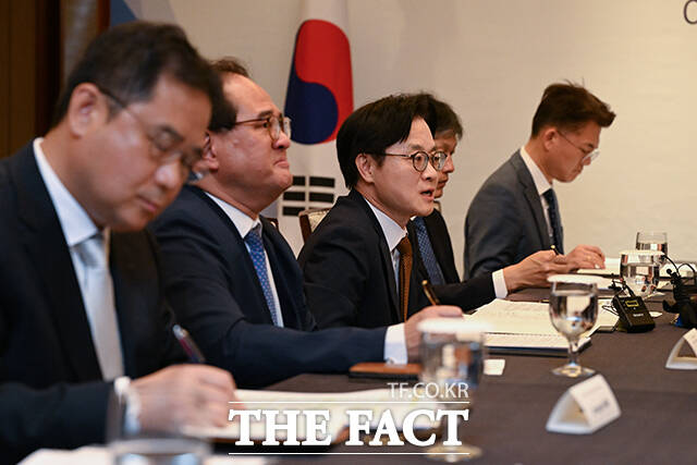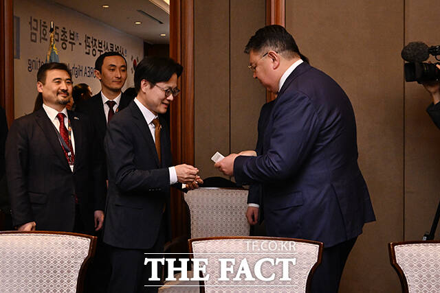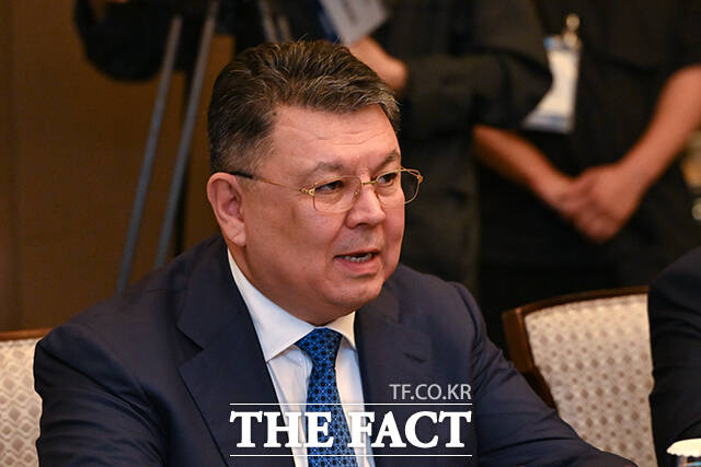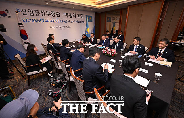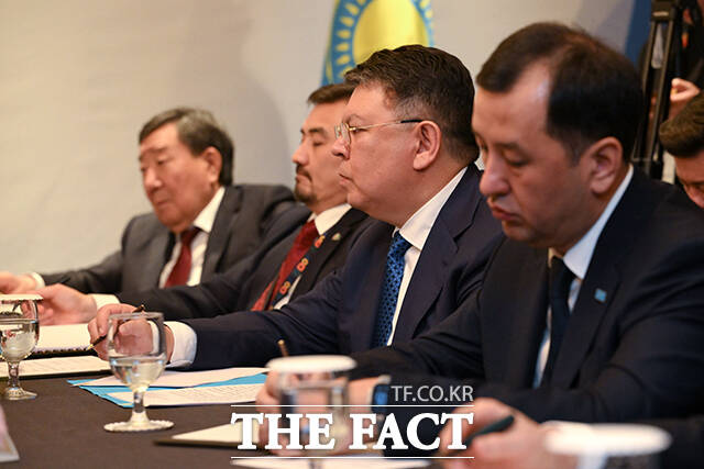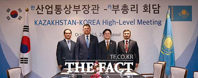 [더팩트ㅣ서예원 기자] 카낫 보줌바예프(Kanat Bozumbayev) 카자흐스탄 부총리(왼쪽)와 김정관 산업통상부 장관이 15일 오후 서울 중구 롯데호텔 서울에서 열린 '한국 산업통상부장관-카자흐스탄 부총리 회담'에 참석해 기념 촬영을 하고 있다.