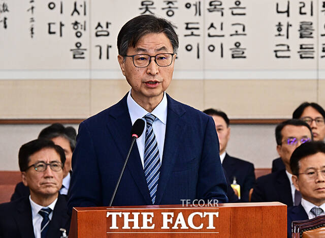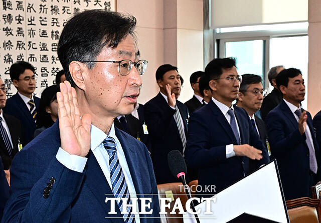 [더팩트ㅣ국회=배정한 기자] 최재해 감사원장이 16일 오전 서울 여의도 국회 법제사법위원회에서 열린 감사원에 대한 국정감사에 출석해 증인선서를 하고 있다.