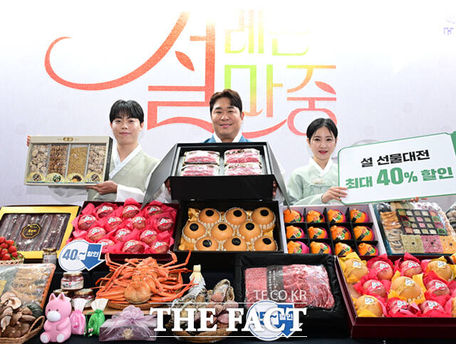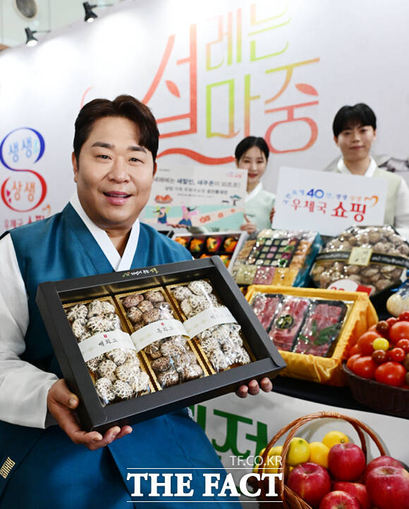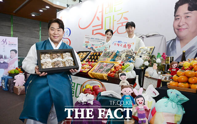 [더팩트ㅣ이새롬 기자] 우체국쇼핑이 설을 맞아 전국 우수 특산물 할인 판매에 나선 29일 서울 중구 서울중앙우체국에서 홍보 모델인 개그맨 문세윤이 모델들과 함께 선물세트를 선보이고 있다.