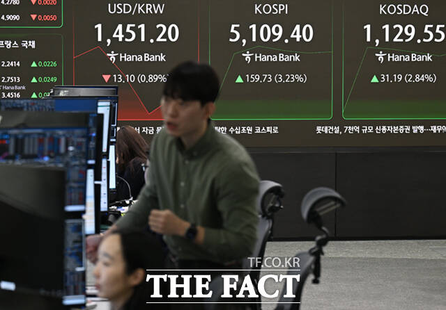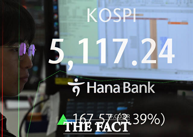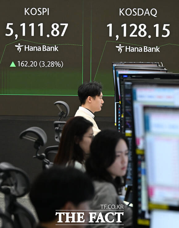 [더팩트ㅣ이새롬 기자] 전날 케빈 워시 전 연준 이사 지명 소식에 따른 '워시 쇼크' 여파로 5% 넘게 급락하며 5000선을 내줬던 코스피가 3일 반등하며 5100선을 회복한 가운데, 서울 중구 하나은행 본점 딜링룸 전광판에 지수가 표시되고 있다.